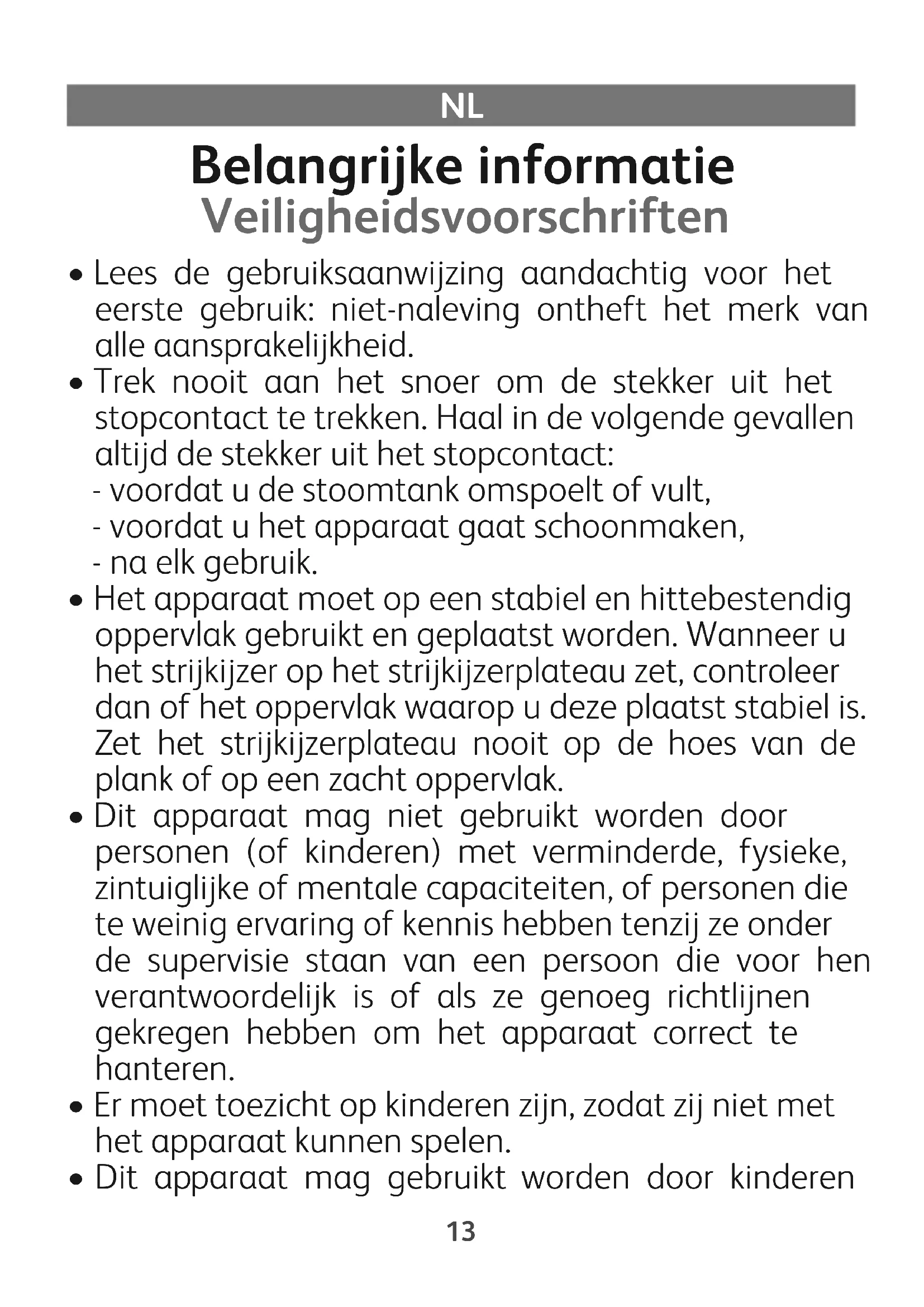 - Dit apparaat mag niet gebruikt worden door personen (of kinderen) met verminderde, fysieke, zintuiglijke of mentale capaciteiten, of personen die te weinig ervaring of kennis hebben tenzij ze onder de supervisie staan van een persoon die voor hen verantwoordelijk is of als ze genoeg richtlijnen gekregen hebben om het apparaat correct te hanteren.