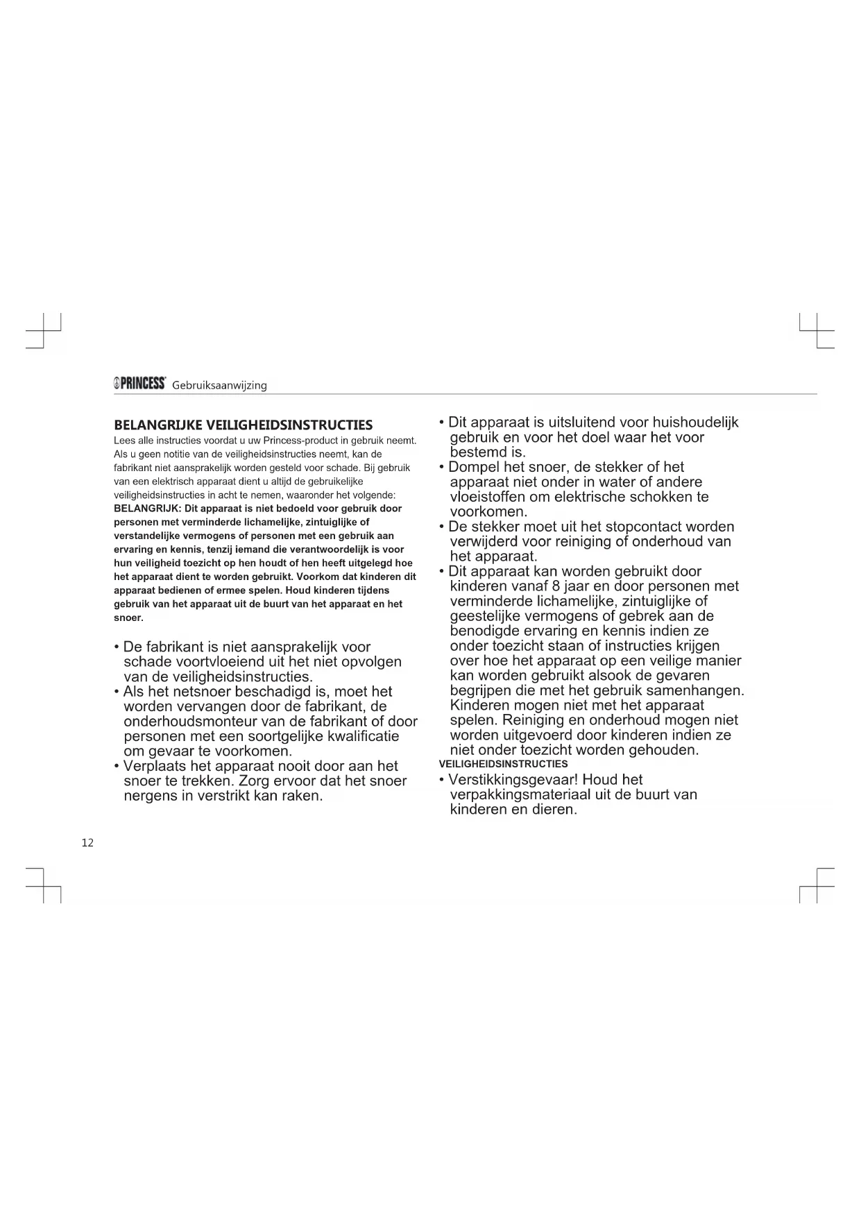 BELANGRIJKE VEILIGHEIDSINSTRUCTIES Lees alle instructies voordat u uw Princess-product in gebruik neemt. Als u geen notitie van de veiligheidsinstructies neemt, kan de fabrikant niet aansprakelijk worden gesteld voor schade. Bij gebruik van een elektrisch apparaat dient u altijd de gebruikelijke veiligheidsinstructies in acht te nemen, waaronder het volgende: BELANGRIJK: Dit apparaat is niet bedoeld voor gebruik door personen met verminderde lichamelijke, zintuiglijke of verstandelijke vermogens of personen met een gebruik aan ervaring en kennis, tenzij iemand die verantwoordelijk is voor hun veiligheid toezicht op hen houdt of hen heeft uitgelegd hoe het apparaat dient te worden gebruikt. Voorkom dat kinderen dit apparaat bedienen of ermee spelen. Houd kinderen tijdens gebruik van het apparaat uit de buurt van het apparaat en het snoer.
