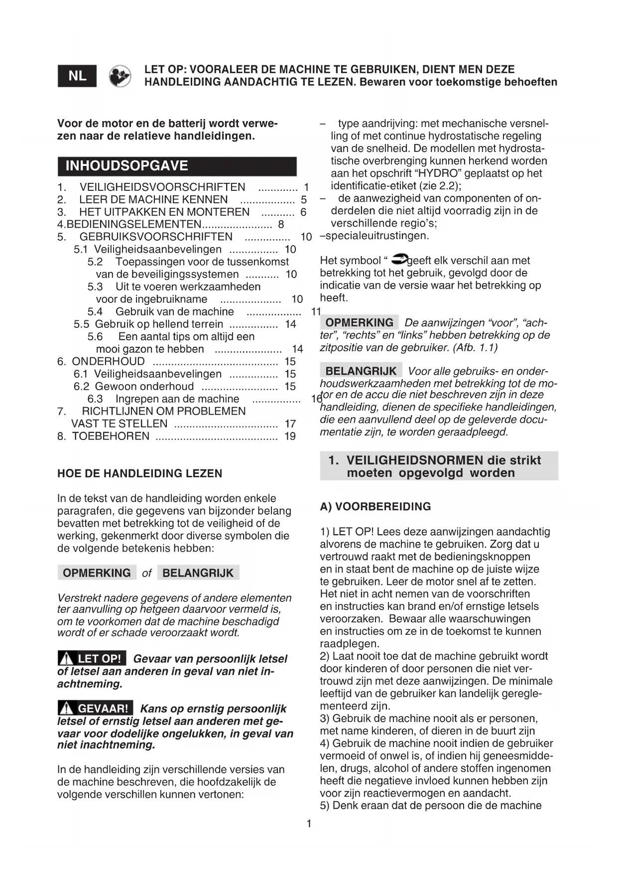 LET OP: VOORALEER DE MACHINE TE GEBRUIKEN, DIENT MEN DEZE HANDLEIDING AANDACHTIG TE LEZEN. Bewaren voor toekomstige behoeften Voor de motor en de batterij wordt verwe- zen naar de relatieve handleidingen. INHOUDSOPGAVE 1. VEILIGHEIDSVOORSCHRIFTEN ............. 1