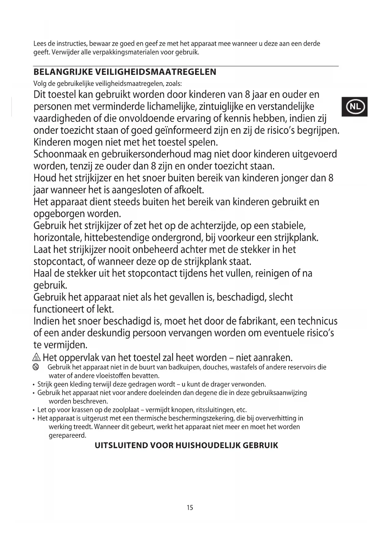 An d’éviter les problèmes occasionnés à l’environnement et à la santé par des substances dangereuses, les appareils et les batteries rechargeables et non rechargeables présentant l’un de ces symboles ne doivent pas être éliminés avec les déchets municipaux non triés. Éliminez dans tous les cas les produits électriques et électroniques et, le cas échéant, les batteries rechargeables et non rechargeables, dans un centre ociel et approprié de collecte/recyclage.15 Lees de instructies, bewaar ze goed en geef ze met het apparaat mee wanneer u deze aan een derde geeft. Verwijder alle verpakkingsmaterialen voor gebruik. BELANGRIJKE VEILIGHEIDSMAATREGELEN Volg de gebruikelijke veiligheidsmaatregelen, zoals: Dit toestel kan gebruikt worden door kinderen van 8 jaar en ouder en personen met verminderde lichamelijke, zintuiglijke en verstandelijke vaardigheden of die onvoldoende ervaring of kennis hebben, indien zij onder toezicht staan of goed geïnformeerd zijn en zij de risico’s begrijpen. Kinderen mogen niet met het toestel spelen. Schoonmaak en gebruikersonderhoud mag niet door kinderen uitgevoerd worden, tenzij ze ouder dan 8 zijn en onder toezicht staan. Houd het strijkijzer en het snoer buiten bereik van kinderen jonger dan 8 jaar wanneer het is aangesloten of afkoelt. Het apparaat dient steeds buiten het bereik van kinderen gebruikt en opgeborgen worden. Gebruik het strijkijzer of zet het op de achterzijde, op een stabiele, horizontale, hittebestendige ondergrond, bij voorkeur een strijkplank. Laat het strijkijzer nooit onbeheerd achter met de stekker in het stopcontact, of wanneer deze op de strijkplank staat. Haal de stekker uit het stopcontact tijdens het vullen, reinigen of na gebruik. Gebruik het apparaat niet als het gevallen is, beschadigd, slecht functioneert of lekt. Indien het snoer beschadigd is, moet het door de fabrikant, een technicus of een ander deskundig persoon vervangen worden om eventuele risico’s te vermijden. h Het oppervlak van het toestel zal heet worden – niet aanraken. b Gebruik het apparaat niet in de buurt van badkuipen, douches, wastafels of andere reservoirs die water of andere vloeistoen bevatten.