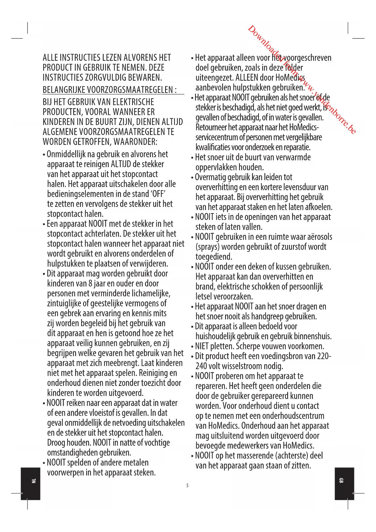 - NOOIT op het masserende (achterste) deel van het apparaat gaan staan of zitten. Downloaded from www.vandenborre.be6