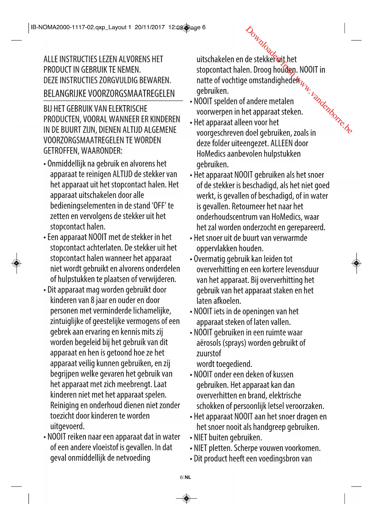- Dit is geen professioneel apparaat, het is bedoeld voor persoonlijk gebruik en om vermoeide spieren een verzachtende massage te geven. NOOIT gebruiken als vervanging van medische zorg. IB-NOMA2000-1117-02.qxp_Layout 1 20/11/2017 12:08 Page 7 Downloaded from www.vandenborre.be• NIET voor het naar bed gaan gebruiken. De massage heeft een stimulerend effect en kan de slaap uitstellen.