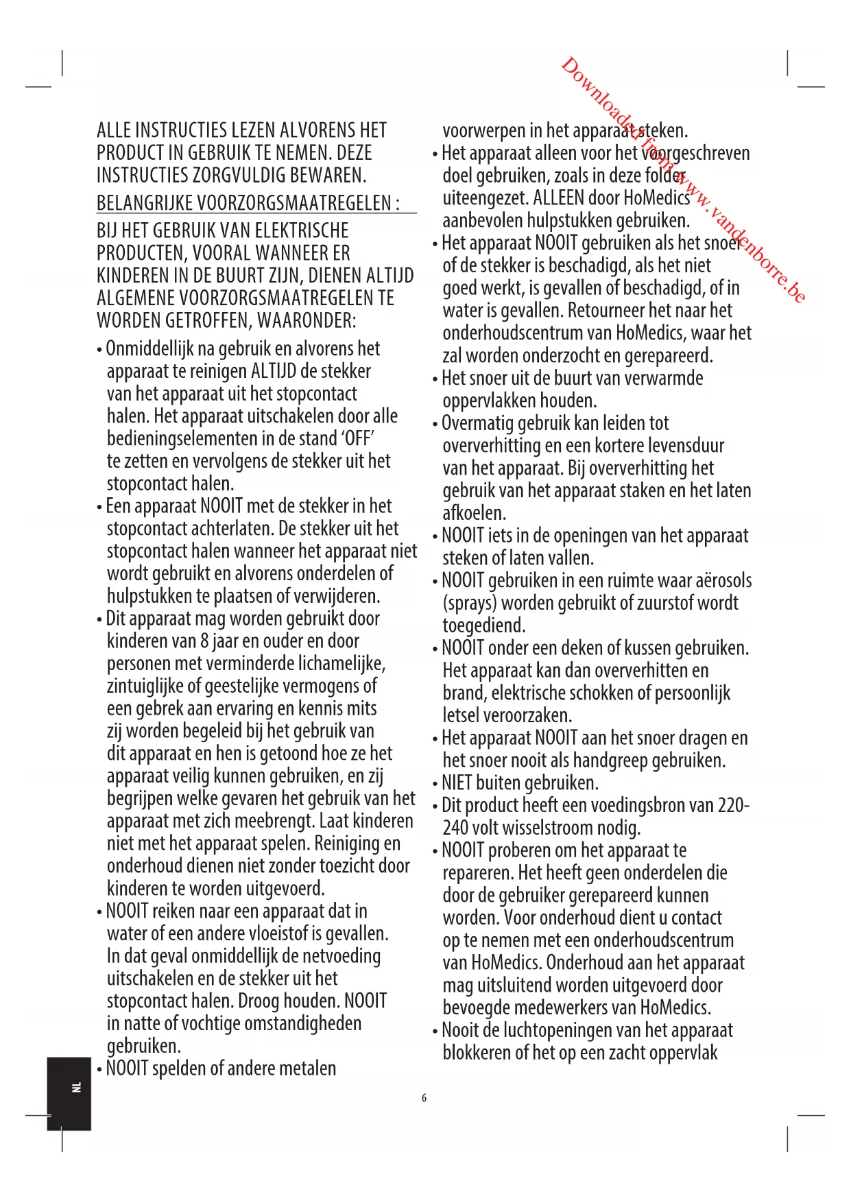 - Het apparaat NOOIT gebruiken als het snoer of de stekker is beschadigd, als het niet goed werkt, is gevallen of beschadigd, of in water is gevallen. Retourneer het naar het onderhoudscentrum van HoMedics, waar het zal worden onderzocht en gerepareerd.