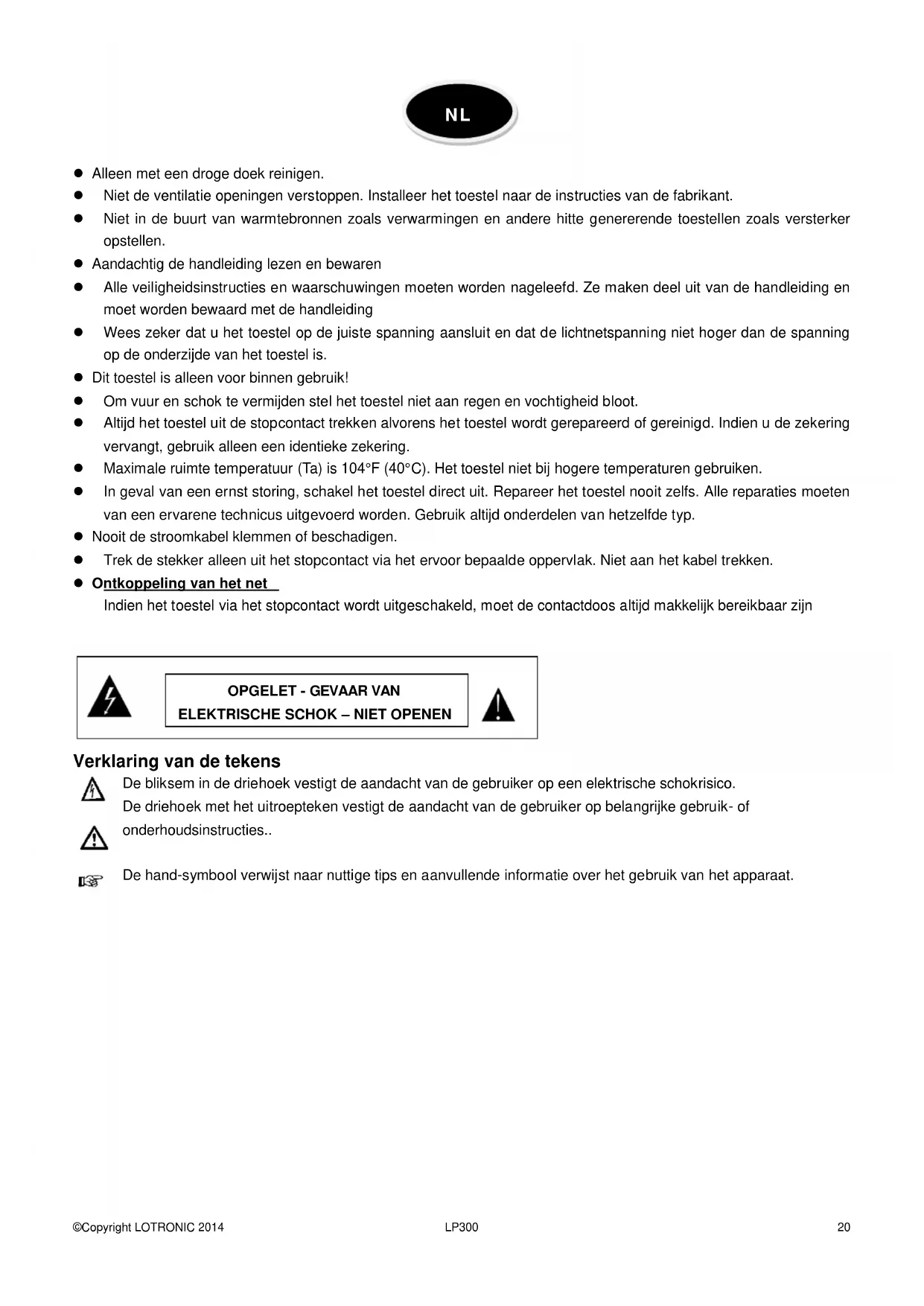 F: Opname is altijd in MONO A: Dit gebeurt vaak met VISTA. In Windows Config recording source kies "stereo" niet "mono" of "microphone" Speler: F: He geluid knakt A: Controleer of de speler op een hoog niveau ingang van de versterker aangesloten is. Hoog niveau ingangen zijn: CD, AUX, TAPE. De PHONE ingang is niet geschikt omdat de speler al een voorversterker bezit. Reinig de pickup en de schijf Controleer de instelling van het tegengewicht F: Directe opname is niet mogelijk A: De USB stick of SD kaartje zijn tegen opname beschermt. Controleer het bestandsysteem (FAT16) F: Direct opgenomen tracks zijn overstuurt A: Controleer de opname niveau De elektrische producten mogen niet naast het huisvuil geplaatst worden. Gelieve deze te laten recycleren daar waar er centra’s hiervoor voorzien is. Raadpleeg de plaatselijke autoriteiten of uw verkoper ivm de manier van recycleren©Copyright LOTRONIC 2014 LP300 25
