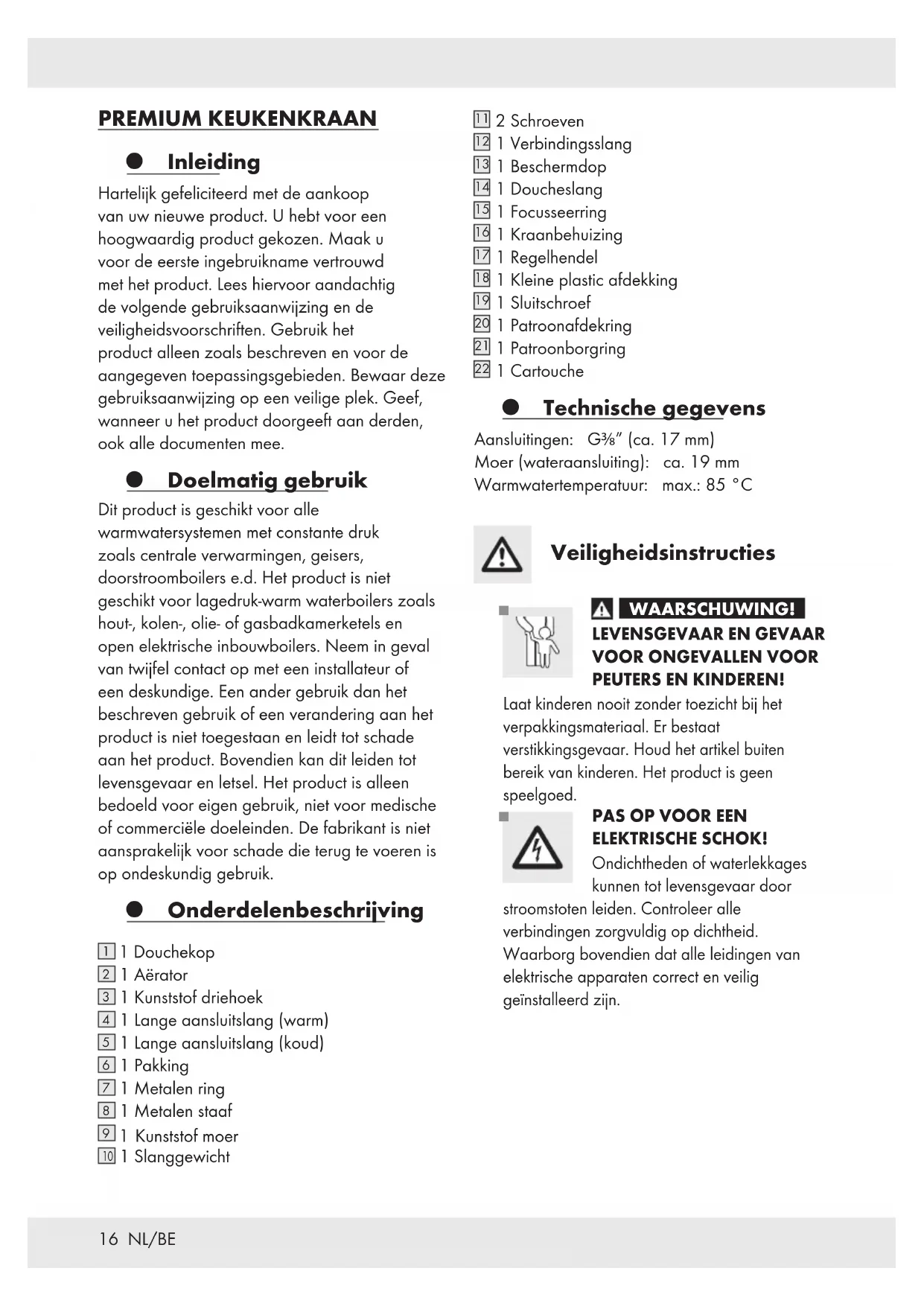 regelmatig los en verwijder kalkhoudende resten of vreemde objecten. Bij het niet in acht nemen van de onderhoudsinstructies dient u rekening te houden met beschadigingen aan het oppervlak. In dit geval komen de garantieclaims te vervallen. Afvoer De verpakking bestaat uit milieuvriendelijke grondstoffen die u via de plaatselijke recyclingcontainers kunt afvoeren. Informatie over de mogelijkheden om het uitgediende product na gebruik te verwijderen, verstrekt uw gemeentelijke overheid. Informatie Drinkbaarheid van leidingwater Informeer bij uw gemeente over de drinkbaarheid van het water in uw stad / gemeente.19 NL/BE Principieel gelden de volgende adviezen voor de drinkbaarheid: Laat water uit leidingen even lopen als het langer dan vier uur in de leidingen heeft gestaan. Gebruik geen stagnatiewater voor het bereiden van voeding en drank, vooral niet bij het voeden van zuigelingen. Anders kan gevaar voor de gezondheid ontstaan. Vers water kunt u daaraan herkennen dat het duidelijk kouder uit de leiding komt dan stagnatiewater. Gebruik geen stagnatiewater uit verchroomde leidingen voor de voeding en / of lichamelijke verzorging wanneer u allergisch op nikkel reageert. Dergelijk water kan sterk nikkelhoudend zijn en een allergische reactie veroorzaken. Gebruik geen drinkwater uit loden leidingen voor de bereiding van voeding voor zuigelingen en / of voor de bereiding van levensmiddelen tijdens de zwangerschap. Lood wordt aan het drinkwater afgegeven en is vooral voor zuigelingen en kleine kinderen uiterst schadelijk voor de gezondheid. Garantie Het product wordt volgens strenge kwaliteitsrichtlijnen zorgvuldig geproduceerd en voor levering grondig getest. In geval van schade aan het product kunt u rechtmatig beroep doen op de verkoper van het product. Deze wettelijke rechten worden door onze hierna vermelde garantie niet beperkt. Op dit product verlenen wij 5jaar garantie vanaf aankoopdatum. De garantieperiode start op de dag van aankoop. Bewaar de originele kassabon alstublieft. Dit document is nodig als bewijs voor aankoop. Wanneer binnen 5jaar na de aankoopdatum van dit product een materiaal- of productiefout optreedt, dan wordt het product door ons –naar onze keuze– gratis voor u gerepareerd of vervangen. Deze garantie komt te vervallen als het product beschadigd wordt, niet correct gebruikt of onderhouden wordt. De garantie geldt voor materiaal- en productiefouten. Deze garantie is niet van toepassing op productonderdelen, die onderhevig zijn aan normale slijtage en hierdoor als aan slijtage onderhevige onderdelen gelden (bijv. batterijen) of voor beschadigingen aan breekbare onderdelen, zoals bijv. schakelaars, accu’s of dergelijke onderdelen, die gemaakt zijn van glas.20 CZ