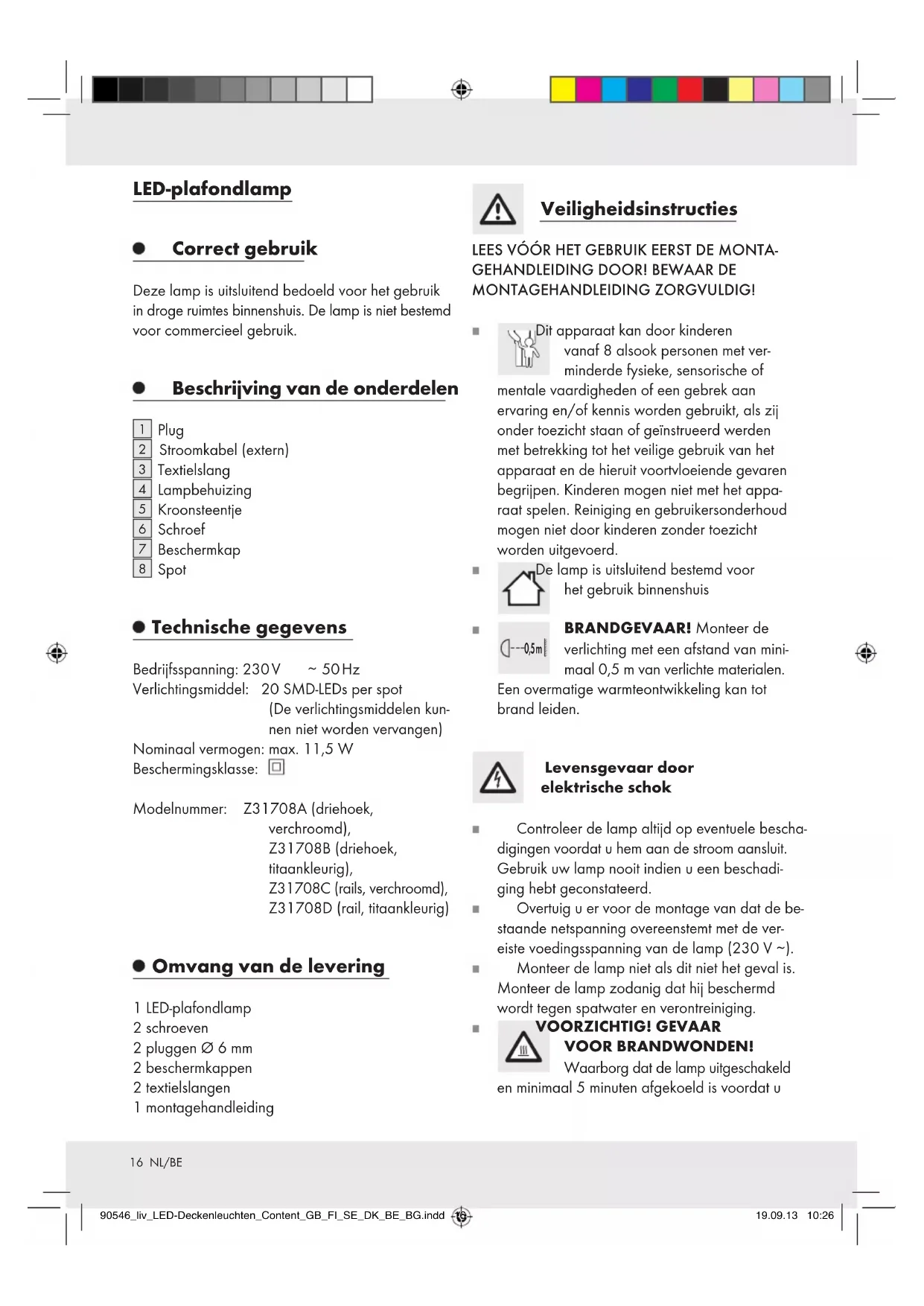 kunnen ca. 90° verticaal en ca. 330° horizontaal worden ingesteld, om voor gerichte lichtaccenten te zorgen (zie afb. E). ATTENTIE: De spots worden tijdens het gebruik heet. Schakel ze uit en laat ze 5 minuten afkoelen, voordat u ze aanraakt. Reiniging en onderhoud Voordat u met de reiniging en het onderhoud van de lamp begint, dient u de stroomverbinding eerst te verbreken (zekering verwijderen of de hoofd- schakelaar in de zekeringenkast uitschakelen – 0-stand) en laat hem vervolgens gedurende 5 minuten afkoelen! Op basis van de elektrische veiligheid mag de verlichting nooit met water of andere vloeistoffen worden gereinigd of in zijn geheel in water worden gedompeld. Gebruik geen oplosmiddelen zoals benzine e.d. Het lamp zal hierdoor beschadigd raken. Gebruik voor de reiniging alleen een droge, pluisvrije doek. Verwijdering De verpakking bestaat uit milieuvriende- lijke grondstoffen die u via de plaatse- lijke recyclingcontainers kunt afvoeren. 90546_liv_LED-Deckenleuchten_Content_GB_FI_SE_DK_BE_BG.indd 17 19.09.13 10:2618 NL/BE Informatie over de mogelijkheden, hoe u het afgedankte product weg kunt werpen, verstrekt uw gemeentelijke overheid. Verwijder het apparaat/het product in geen geval via het normale huisvuil. Gooi het apparaat / het product via een geautoriseerd afvalverwijderingsbedrijf of via uw gemeentelijke milieupark weg. Neem de geldige voorschriften in acht. Neem in geval van twijfel contact op met het gemeentelijke afvaldienst. EMC 90546_liv_LED-Deckenleuchten_Content_GB_FI_SE_DK_BE_BG.indd 18 19.09.13 10:2619 BG Светодиоден абажур Употреба по предназначение Осветителното тяло е предназначено за употреба само в сухи закрити помещения. Ос- ветителното тяло не е предназначено за профе- сионални цели. Описание на частите