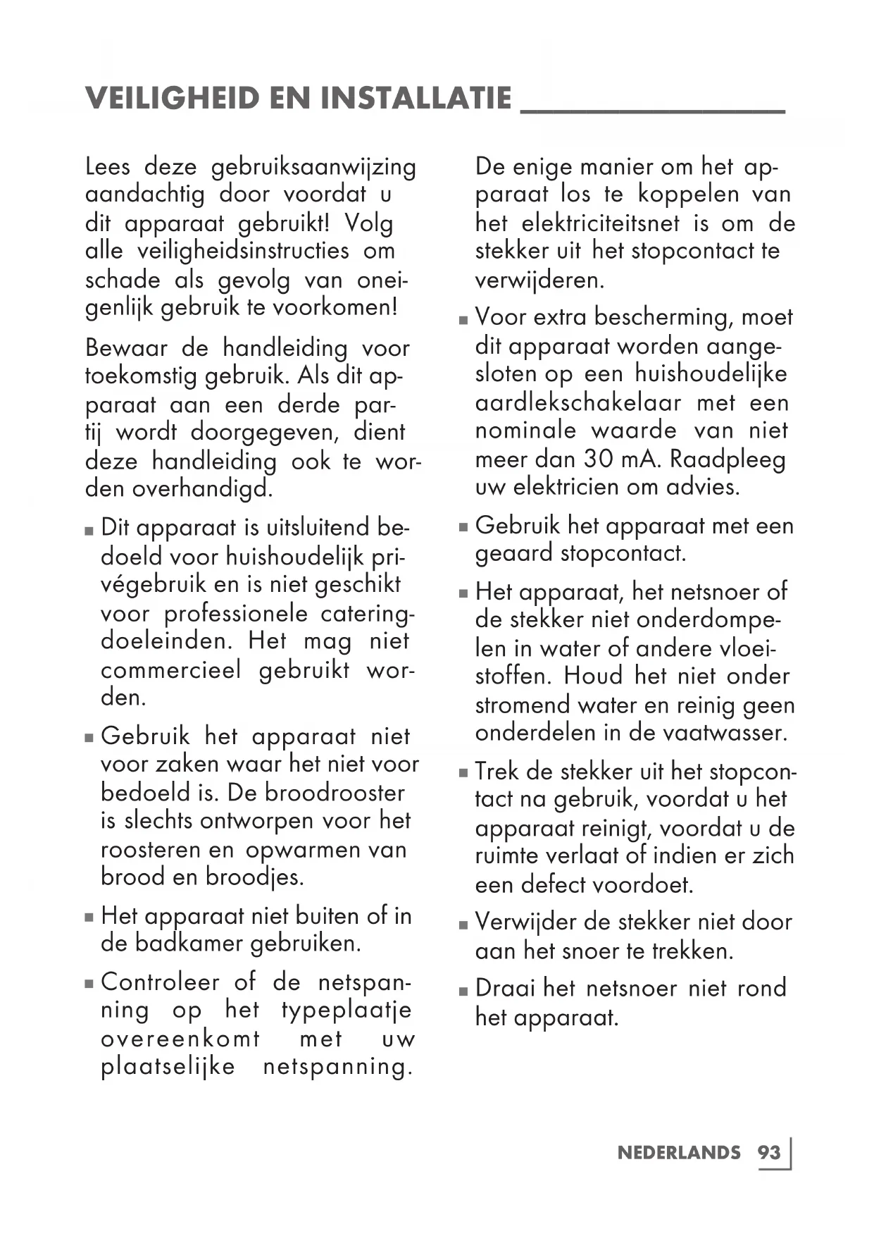 Gebruik het apparaat niet voor zaken waar het niet voor bedoeld is. De broodrooster is slechts ontworpen voor het roosteren en opwarmen van brood en broodjes.