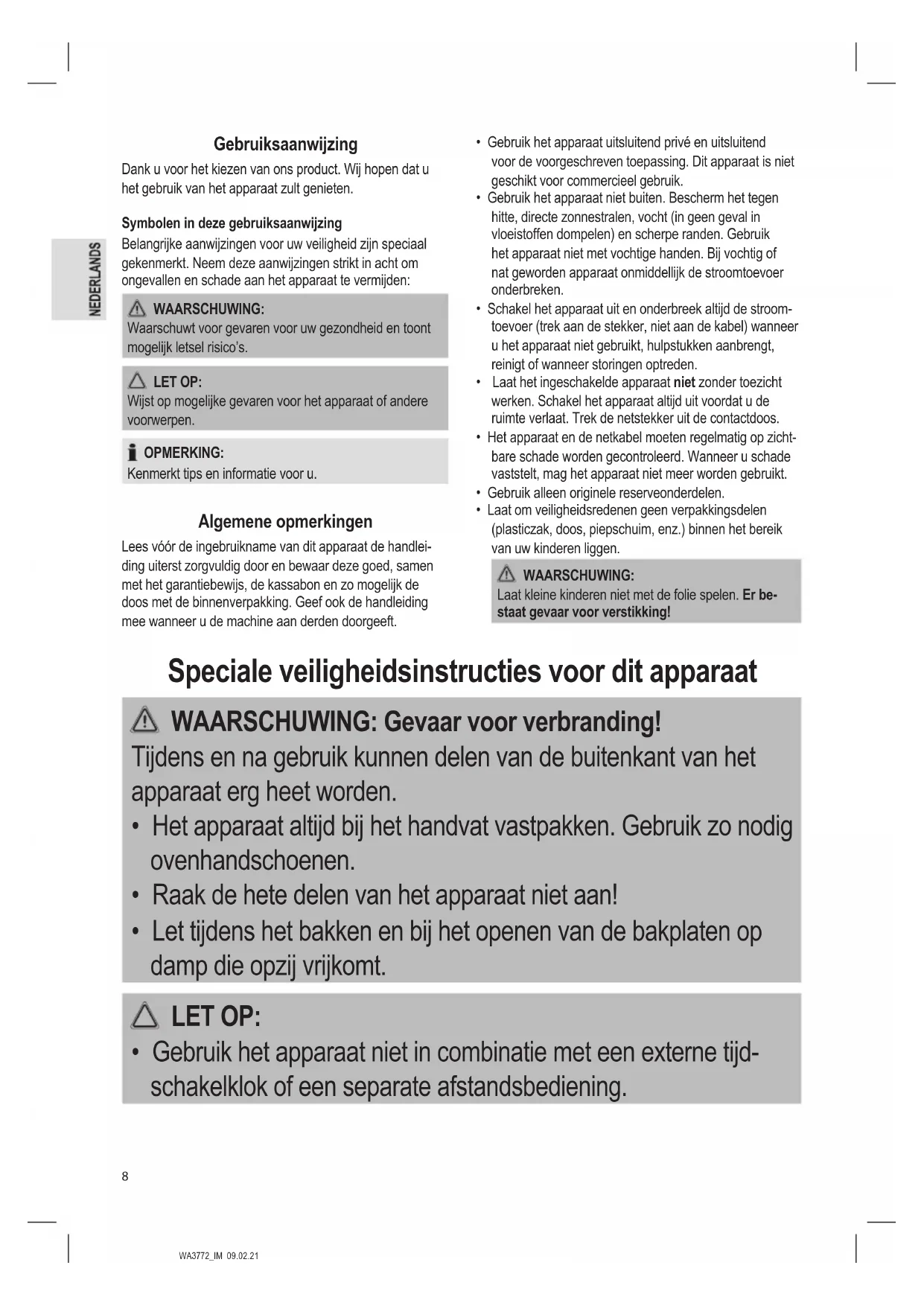 - Let tijdens het bakken en bij het openen van de bakplaten op damp die opzij vrijkomt. LET OP: