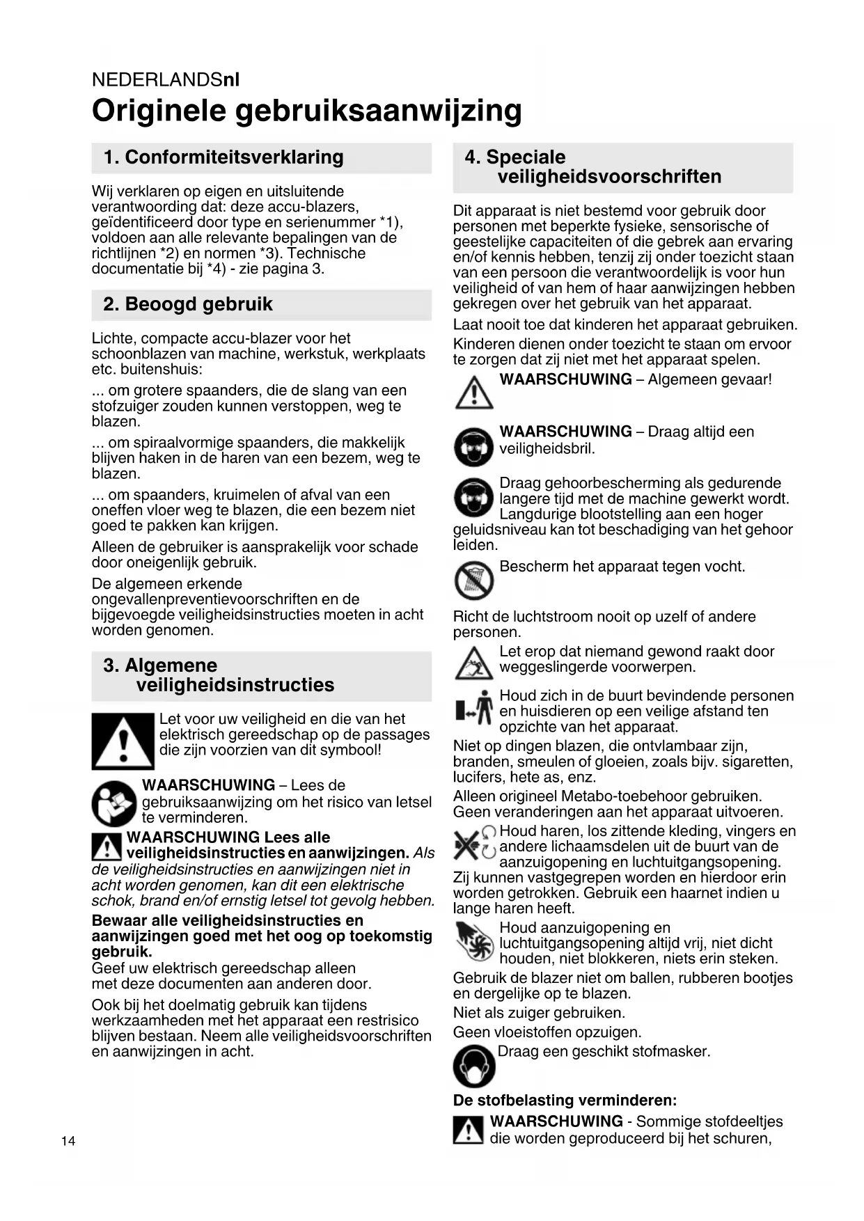 Originele gebruiksaanwijzing Wij verklaren op eigen en uitsluitende verantwoording dat: deze accu-blazers, geïdentificeerd door type en serienummer *1), voldoen aan alle relevante bepalingen van de richtlijnen *2) en normen *3). Technische documentatie bij *4) - zie pagina 3. Lichte, compacte accu-blazer voor het schoonblazen van machine, werkstuk, werkplaats etc. buitenshuis: ... om grotere spaanders, die de slang van een stofzuiger zouden kunnen verstoppen, weg te blazen. ... om spiraalvormige spaanders, die makkelijk blijven haken in de haren van een bezem, weg te blazen. ... om spaanders, kruimelen of afval van een oneffen vloer weg te blazen, die een bezem niet goed te pakken kan krijgen. Alleen de gebruiker is aansprakelijk voor schade door oneigenlijk gebruik. De algemeen erkende ongevallenpreventievoorschriften en de bijgevoegde veiligheidsinstructies moeten in acht worden genomen. Let voor uw veiligheid en die van het elektrisch gereedschap op de passages die zijn voorzien van dit symbool! WAARSCHUWING – Lees de gebruiksaanwijzing om het risico van letsel te verminderen. WAARSCHUWING Lees alle veiligheidsinstructies en aanwijzingen. Als de veiligheidsinstructies en aanwijzingen niet in acht worden genomen, kan dit een elektrische schok, brand en/of ernstig letsel tot gevolg hebben. Bewaar alle veiligheidsinstructies en aanwijzingen goed met het oog op toekomstig gebruik. Geef uw elektrisch gereedschap alleen met deze documenten aan anderen door. Ook bij het doelmatig gebruik kan tijdens werkzaamheden met het apparaat een restrisico blijven bestaan. Neem alle veiligheidsvoorschriften en aanwijzingen in acht. Dit apparaat is niet bestemd voor gebruik door personen met beperkte fysieke, sensorische of geestelijke capaciteiten of die gebrek aan ervaring en/of kennis hebben, tenzij zij onder toezicht staan van een persoon die verantwoordelijk is voor hun veiligheid of van hem of haar aanwijzingen hebben gekregen over het gebruik van het apparaat. Laat nooit toe dat kinderen het apparaat gebruiken. Kinderen dienen onder toezicht te staan om ervoor te zorgen dat zij niet met het apparaat spelen. WAARSCHUWING – Algemeen gevaar! WAARSCHUWING – Draag altijd een veiligheidsbril. Draag gehoorbescherming als gedurende langere tijd met de machine gewerkt wordt. Langdurige blootstelling aan een hoger geluidsniveau kan tot beschadiging van het gehoor leiden. Bescherm het apparaat tegen vocht. Richt de luchtstroom nooit op uzelf of andere personen. Let erop dat niemand gewond raakt door weggeslingerde voorwerpen. Houd zich in de buurt bevindende personen en huisdieren op een veilige afstand ten opzichte van het apparaat. Niet op dingen blazen, die ontvlambaar zijn, branden, smeulen of gloeien, zoals bijv. sigaretten, lucifers, hete as, enz. Alleen origineel Metabo-toebehoor gebruiken. Geen veranderingen aan het apparaat uitvoeren. Houd haren, los zittende kleding, vingers en andere lichaamsdelen uit de buurt van de aanzuigopening en luchtuitgangsopening. Zij kunnen vastgegrepen worden en hierdoor erin worden getrokken. Gebruik een haarnet indien u lange haren heeft. Houd aanzuigopening en luchtuitgangsopening altijd vrij, niet dicht houden, niet blokkeren, niets erin steken. Gebruik de blazer niet om ballen, rubberen bootjes en dergelijke op te blazen. Niet als zuiger gebruiken. Geen vloeistoffen opzuigen. Draag een geschikt stofmasker. De stofbelasting verminderen: WAARSCHUWING - Sommige stofdeeltjes die worden geproduceerd bij het schuren,
