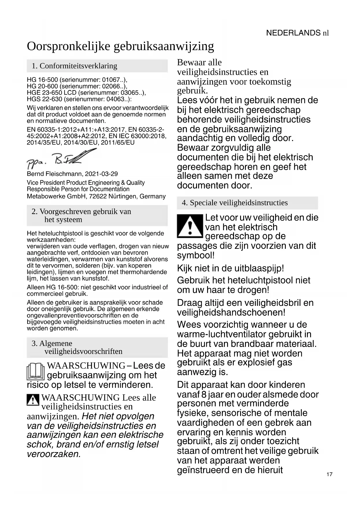 Oorspronkelijke gebruiksaanwijzing HG 16-500 (serienummer: 01067..), HG 20-600 (serienummer: 02066..), HGE 23-650 LCD (serienummer: 03065..), HGS 22-630 (serienummer: 04063..): Wij verklaren en stellen ons ervoor verantwoordelijk dat dit product voldoet aan de genoemde normen en normatieve documenten. EN 60335-1:2012+A11:+A13:2017, EN 60335-2- 45:2002+A1:2008+A2:2012, EN IEC 63000:2018, 2014/35/EU, 2014/30/EU, 2011/65/EU Bernd Fleischmann, 2021-03-29 Vice President Product Engineering & Quality Responsible Person for Documentation Metabowerke GmbH, 72622 Nürtingen, Germany Het heteluchtpistool is geschikt voor de volgende werkzaamheden: verwijderen van oude verflagen, drogen van nieuw aangebrachte verf, ontdooien van bevroren waterleidingen, verwarmen van kunststof alvorens dit te vervormen, solderen (bijv. van koperen leidingen), lijmen en voegen met thermohardende lijm, het lassen van kunststof. Alleen HG 16-500: niet geschikt voor industrieel of commercieel gebruik. Alleen de gebruiker is aansprakelijk voor schade door oneigenlijk gebruik. De algemeen erkende ongevallenpreventievoorschriften en de bijgevoegde veiligheidsinstructies moeten in acht worden genomen. WAARSCHUWING – Lees de gebruiksaanwijzing om het risico op letsel te verminderen. WAARSCHUWING Lees alle veiligheidsinstructies en aanwijzingen. Het niet opvolgen van de veiligheidsinstructies en aanwijzingen kan een elektrische schok, brand en/of ernstig letsel veroorzaken. Bewaar alle veiligheidsinstructies en aanwijzingen voor toekomstig gebruik. Lees vóór het in gebruik nemen de bij het elektrisch gereedschap behorende veiligheidsinstructies en de gebruiksaanwijzing aandachtig en volledig door. Bewaar zorgvuldig alle documenten die bij het elektrisch gereedschap horen en geef het alleen samen met deze documenten door. Let voor uw veiligheid en die van het elektrisch gereedschap op de passages die zijn voorzien van dit symbool! Kijk niet in de uitblaaspijp! Gebruik het heteluchtpistool niet om uw haar te drogen! Draag altijd een veiligheidsbril en veiligheidshandschoenen! Wees voorzichtig wanneer u de warme-luchtventilator gebruikt in de buurt van brandbaar materiaal. Het apparaat mag niet worden gebruikt als er explosief gas aanwezig is. Dit apparaat kan door kinderen vanaf 8 jaar en ouder alsmede door personen met verminderde fysieke, sensorische of mentale vaardigheden of een gebrek aan ervaring en kennis worden gebruikt, als zij onder toezicht staan of omtrent het veilige gebruik van het apparaat werden geïnstrueerd en de hieruit