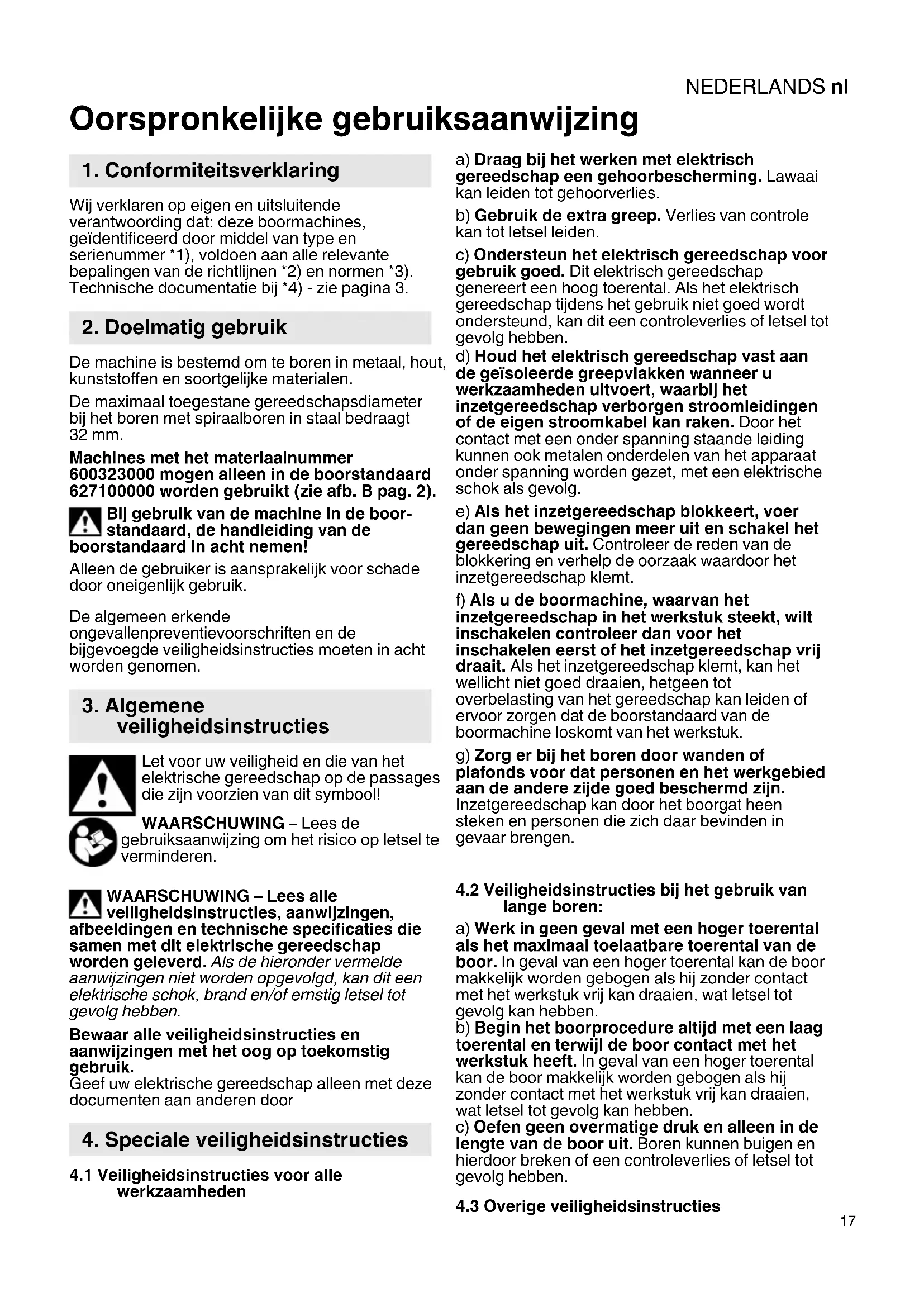 Oorspronkelijke gebruiksaanwijzing Wij verklaren op eigen en uitsluitende verantwoording dat: deze boormachines, geïdentificeerd door middel van type en serienummer *1), voldoen aan alle relevante bepalingen van de richtlijnen *2) en normen *3). Technische documentatie bij *4) - zie pagina 3. De machine is bestemd om te boren in metaal, hout, kunststoffen en soortgelijke materialen. De maximaal toegestane gereedschapsdiameter bij het boren met spiraalboren in staal bedraagt 32 mm. Machines met het materiaalnummer 600323000 mogen alleen in de boorstandaard 627100000 worden gebruikt (zie afb. B pag. 2). Bij gebruik van de machine in de boor- standaard, de handleiding van de boorstandaard in acht nemen! Alleen de gebruiker is aansprakelijk voor schade door oneigenlijk gebruik. De algemeen erkende ongevallenpreventievoorschriften en de bijgevoegde veiligheidsinstructies moeten in acht worden genomen. Let voor uw veiligheid en die van het elektrische gereedschap op de passages die zijn voorzien van dit symbool! WAARSCHUWING – Lees de gebruiksaanwijzing om het risico op letsel te verminderen. WAARSCHUWING – Lees alle veiligheidsinstructies, aanwijzingen, afbeeldingen en technische specificaties die samen met dit elektrische gereedschap worden geleverd. Als de hieronder vermelde aanwijzingen niet worden opgevolgd, kan dit een elektrische schok, brand en/of ernstig letsel tot gevolg hebben. Bewaar alle veiligheidsinstructies en aanwijzingen met het oog op toekomstig gebruik. Geef uw elektrische gereedschap alleen met deze documenten aan anderen door
