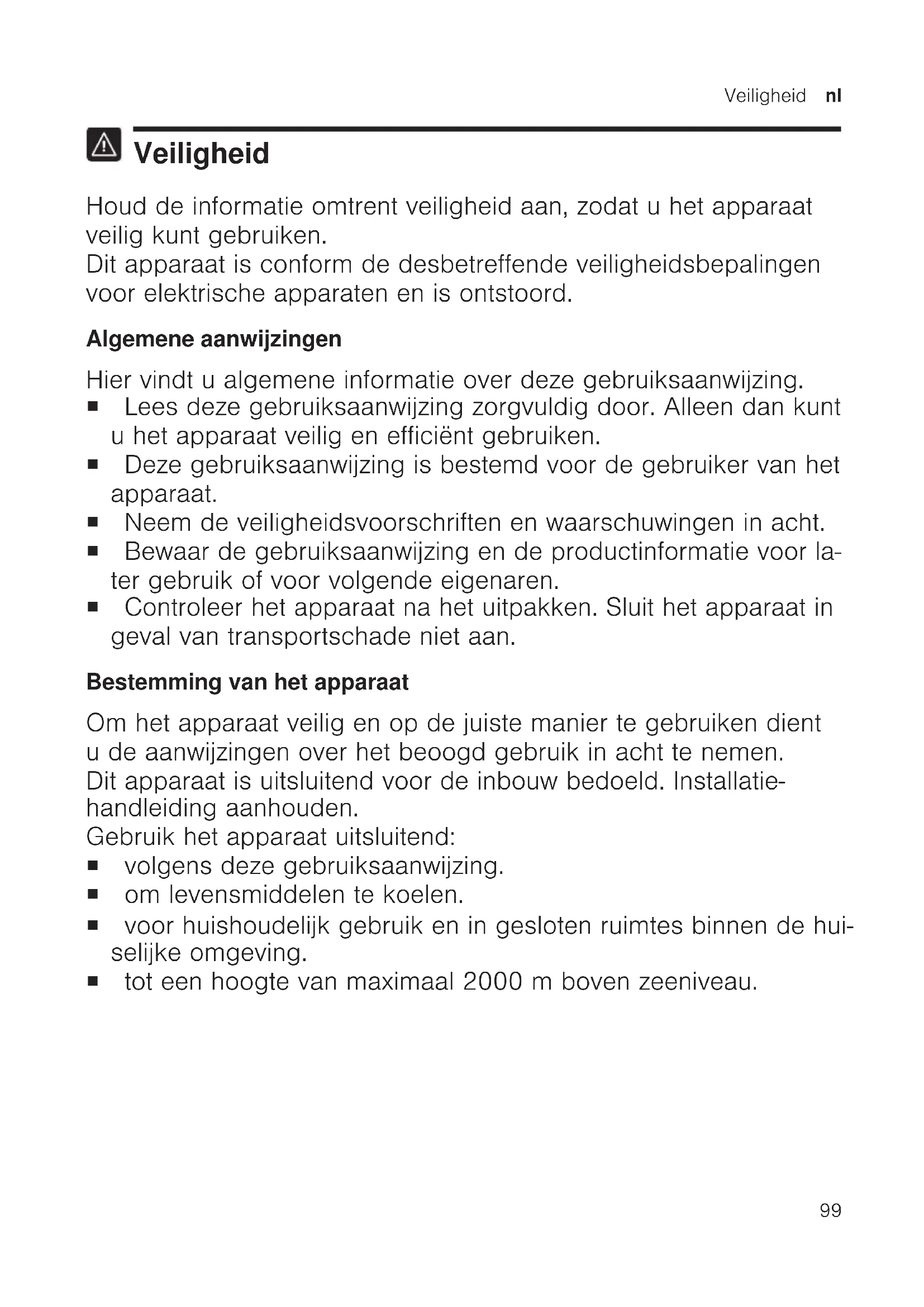 Veiligheid Houd de informatie omtrent veiligheid aan, zodat u het apparaat veilig kunt gebruiken. Dit apparaat is conform de desbetreffende veiligheidsbepalingen voor elektrische apparaten en is ontstoord. Algemene aanwijzingen Hier vindt u algemene informatie over deze gebruiksaanwijzing. ¡ Lees deze gebruiksaanwijzing zorgvuldig door. Alleen dan kunt u het apparaat veilig en efficiënt gebruiken. ¡ Deze gebruiksaanwijzing is bestemd voor de gebruiker van het apparaat. ¡ Neem de veiligheidsvoorschriften en waarschuwingen in acht. ¡ Bewaar de gebruiksaanwijzing en de productinformatie voor la- ter gebruik of voor volgende eigenaren. ¡ Controleer het apparaat na het uitpakken. Sluit het apparaat in geval van transportschade niet aan. Bestemming van het apparaat Om het apparaat veilig en op de juiste manier te gebruiken dient u de aanwijzingen over het beoogd gebruik in acht te nemen. Dit apparaat is uitsluitend voor de inbouw bedoeld. Installatie- handleiding aanhouden. Gebruik het apparaat uitsluitend: ¡ volgens deze gebruiksaanwijzing. ¡ om levensmiddelen te koelen. ¡ voor huishoudelijk gebruik en in gesloten ruimtes binnen de hui- selijke omgeving. ¡ tot een hoogte van maximaal 2000m boven zeeniveau.nl Veiligheid