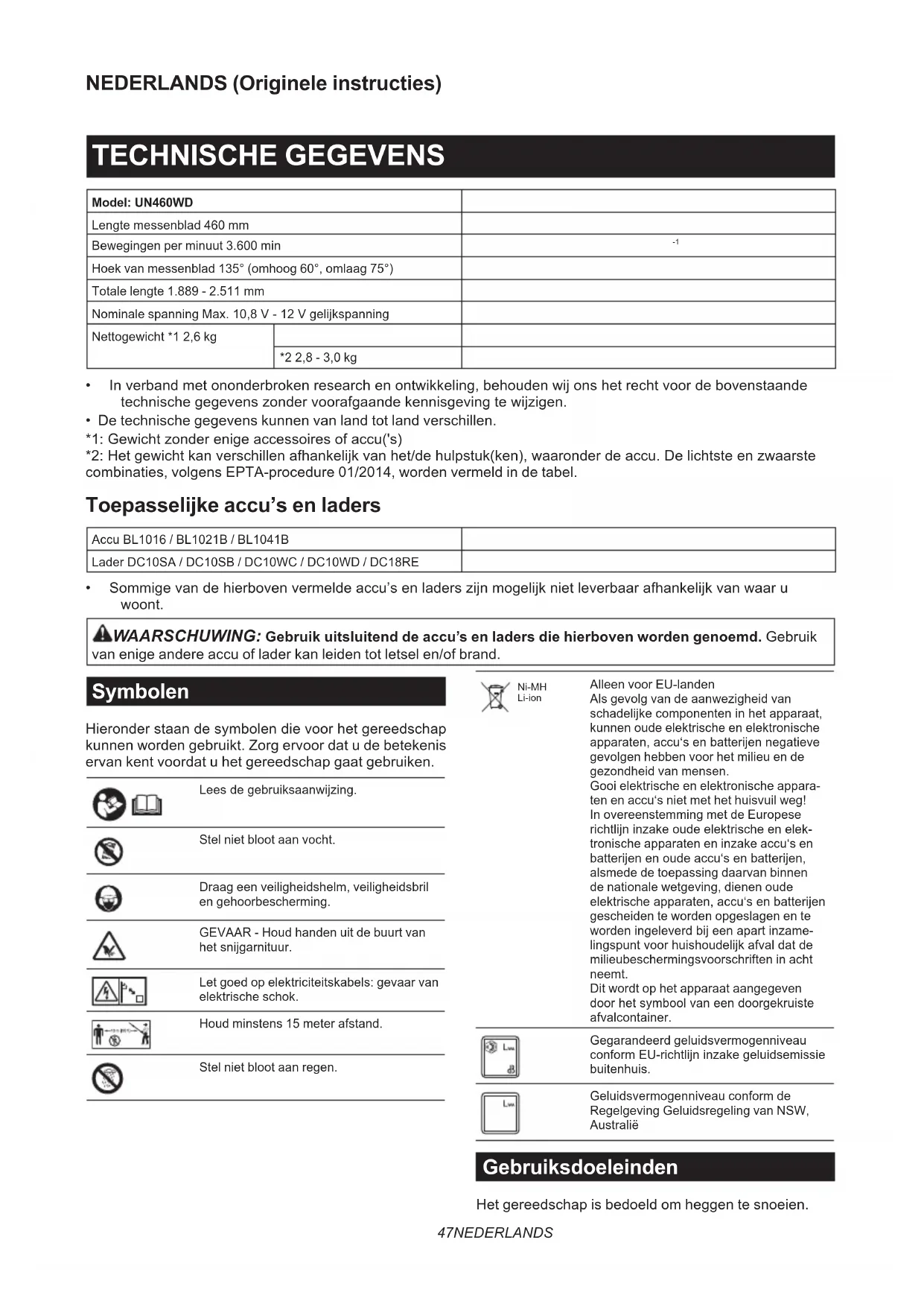- Sommigevandehierbovenvermeldeaccu’senladerszijnmogelijknietleverbaarafhankelijkvanwaaru woont. WAARSCHUWING: Gebruik uitsluitend de accu’s en laders die hierboven worden genoemd. Gebruik van enige andere accu of lader kan leiden tot letsel en/of brand. Symbolen Hieronderstaandesymbolendievoorhetgereedschap kunnen worden gebruikt. Zorg ervoor dat u de betekenis ervan kent voordat u het gereedschap gaat gebruiken. Leesdegebruiksaanwijzing. Stel niet bloot aan vocht. Draag een veiligheidshelm, veiligheidsbril en gehoorbescherming. GEVAAR - Houd handen uit de buurt van hetsnijgarnituur. Let goed op elektriciteitskabels: gevaar van elektrische schok. Houd minstens 15 meter afstand. Stel niet bloot aan regen. Ni-MH Li-ion Alleen voor EU-landen Als gevolg van de aanwezigheid van schadelijkecomponenteninhetapparaat, kunnen oude elektrische en elektronische apparaten,accu‘senbatterijennegatieve gevolgen hebben voor het milieu en de gezondheid van mensen. Gooi elektrische en elektronische appara- ten en accu‘s niet met het huisvuil weg! In overeenstemming met de Europese richtlijninzakeoudeelektrischeenelek- tronische apparaten en inzake accu‘s en batterijenenoudeaccu‘senbatterijen, alsmede de toepassing daarvan binnen de nationale wetgeving, dienen oude elektrischeapparaten,accu‘senbatterijen gescheiden te worden opgeslagen en te wordeningeleverdbijeenapartinzame- lingspuntvoorhuishoudelijkafvaldatde milieubeschermingsvoorschriften in acht neemt. Dit wordt op het apparaat aangegeven doorhetsymboolvaneendoorgekruiste afvalcontainer. Gegarandeerd geluidsvermogenniveau conformEU-richtlijninzakegeluidsemissie buitenhuis. Geluidsvermogenniveau conform de Regelgeving Geluidsregeling van NSW, Australië Gebruiksdoeleinden Het gereedschap is bedoeld om heggen te snoeien.48 NEDERLANDS Geluidsniveau Detypische,A-gewogengeluidsniveauszijngemetenvolgensEN62841-4-2: Geluidsdrukniveau Gegarandeerd geluidsvermogenniveau Gemeten geluidsvermogenniveau