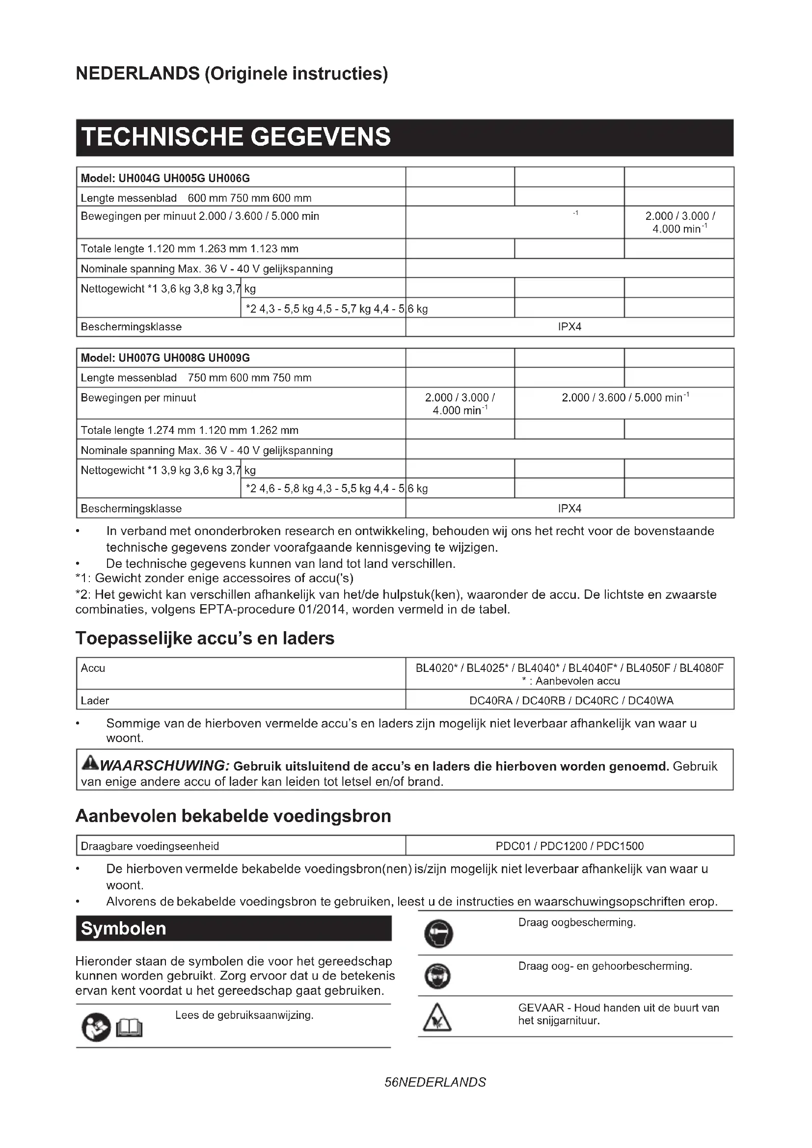 (dB (A)) Onzekerheid K (dB (A)) UH004G 88 3 98 96 2,2 UH005G 89 3 99 97 1,8 UH006G 84 3 94 92 2,2 UH007G 84 3 94 92 1,7 UH008G 85 3 95 93 2,1 UH009G 86 3 96 94 1,6 OPMERKING:Deopgegevengeluidsemissiewaarde(n)is/zijngemetenvolgenseenstandaardtestmethodeen kan/kunnenwordengebruiktomditgereedschaptevergelijkenmetanderegereedschappen. OPMERKING: Deopgegevengeluidsemissiewaarde(n)kan/kunnenookwordengebruiktvooreenbeoordelingvoorafvandeblootstelling. WAARSCHUWING: Draag gehoorbescherming. WAARSCHUWING: De geluidsemissie tijdens het gebruik van het elektrisch gereedschap in de prak- tijk kan verschillen van de opgegeven waarde(n) afhankelijk van de manier waarop het gereedschap wordt gebruikt, met name van het soort werkstuk waarmee wordt gewerkt. WAARSCHUWING: Zorg ervoor dat veiligheidsmaatregelen worden getroen ter bescherming van de gebruiker die zijn gebaseerd op een schatting van de blootstelling onder praktijkomstandigheden (reke- ning houdend met alle fasen van de bedrijfscyclus, zoals de tijdsduur gedurende welke het gereedschap is uitgeschakeld en stationair draait, naast de ingeschakelde tijdsduur). Trilling Detotaletrillingswaarde(triaxialevectorsom)zoalsvastgesteldvolgensEN62841-4-2: Model Voorhandgreep Achterhandgreep ah (m/s