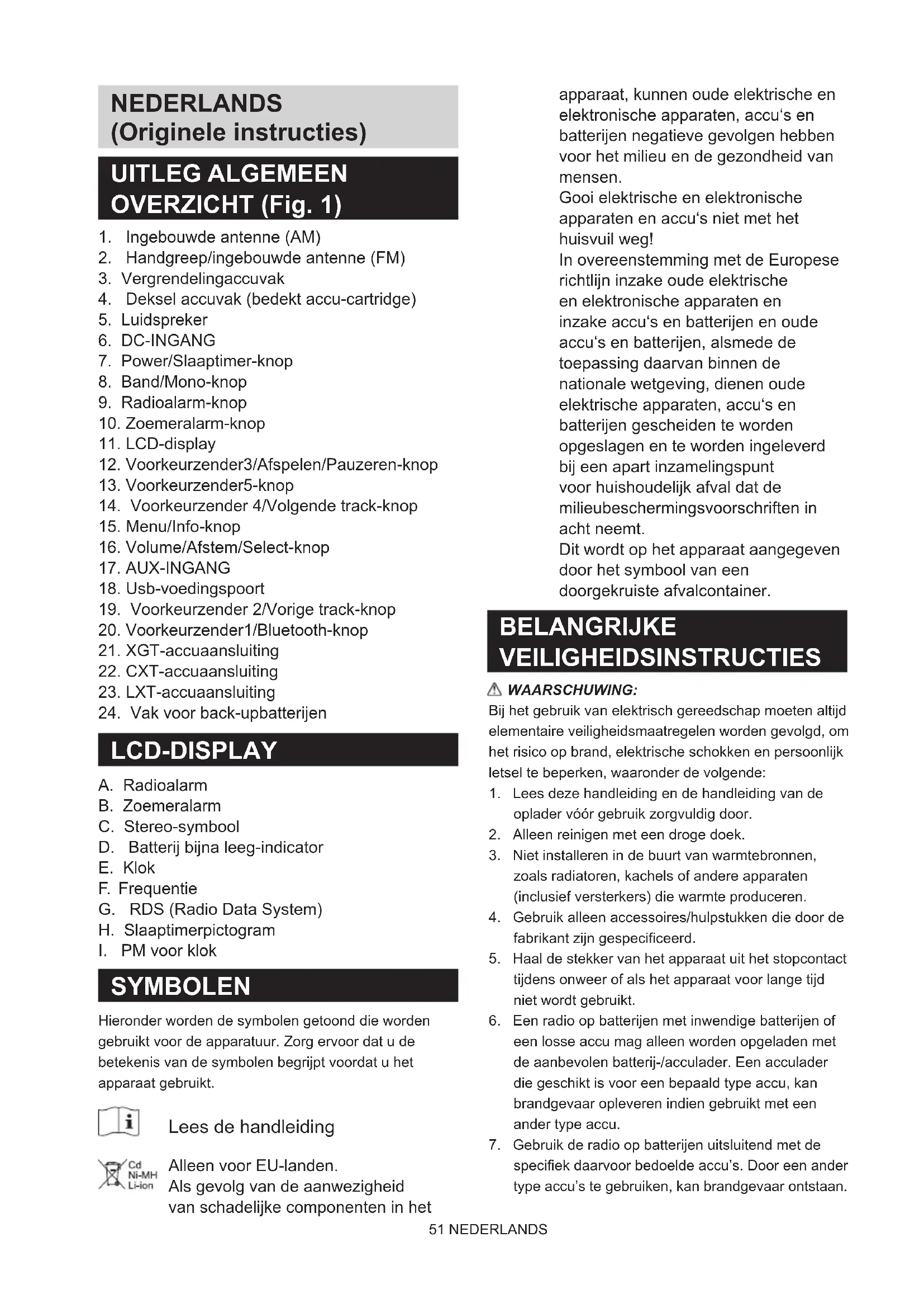 volume op uw audioapparaat te verhogen tot meer dan tweederde van het maximale niveau en daarna het volume op de radio naar wens in te stellen. OPMERKING: Audiokabel wordt niet meegeleverd als standaardaccessoire. ONDERHOUD LET OP: ● Gebruik nooit benzine, wasbenzine, thinner, alcohol, enz. Dit kan leiden tot verkleuren, vervormen of barsten. ● Was de radio niet met water.62 NEDERLANDS TECHNISCHE GEGEVENS Voedingsvereisten Netspanningsadapter 12V DC 2.5A, middenpen positief Batterij UM-3 (AA-formaat) x 2 voor back-up Schuifaccu: 10.8V – 36 V Frequentiebereik FM 87.50-108MHz (0.05MHz/stap) AM (MW) 522-1,710kHz (9kHz/stap) Bluetooth
