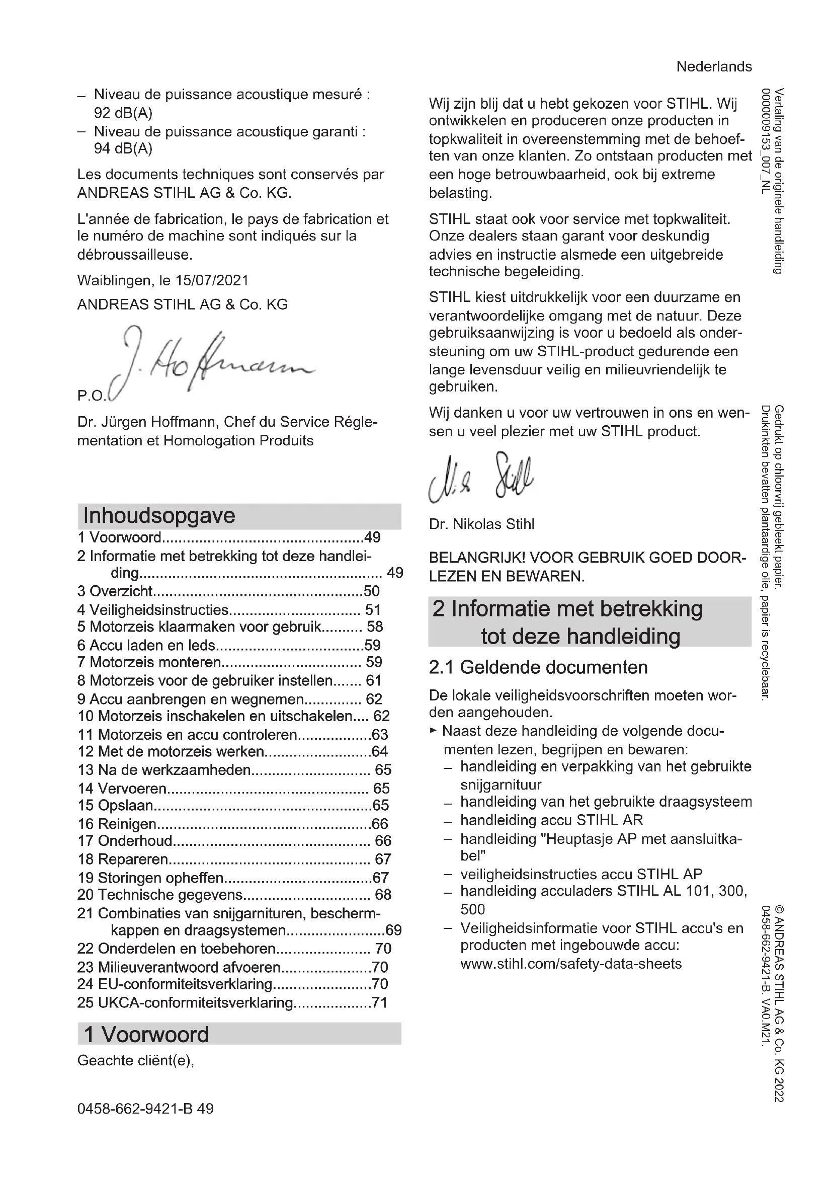 - Niveau de puissance acoustique garanti : 94 dB(A) Les documents techniques sont conservés par ANDREAS STIHL AG & Co. KG. L'année de fabrication, le pays de fabrication et le numéro de machine sont indiqués sur la débroussailleuse. Waiblingen, le 15/07/2021 ANDREAS STIHL AG & Co. KG P.O. Dr. Jürgen Hoffmann, Chef du Service Régle‐ mentation et Homologation Produits Inhoudsopgave 1 Voorwoord p. 49