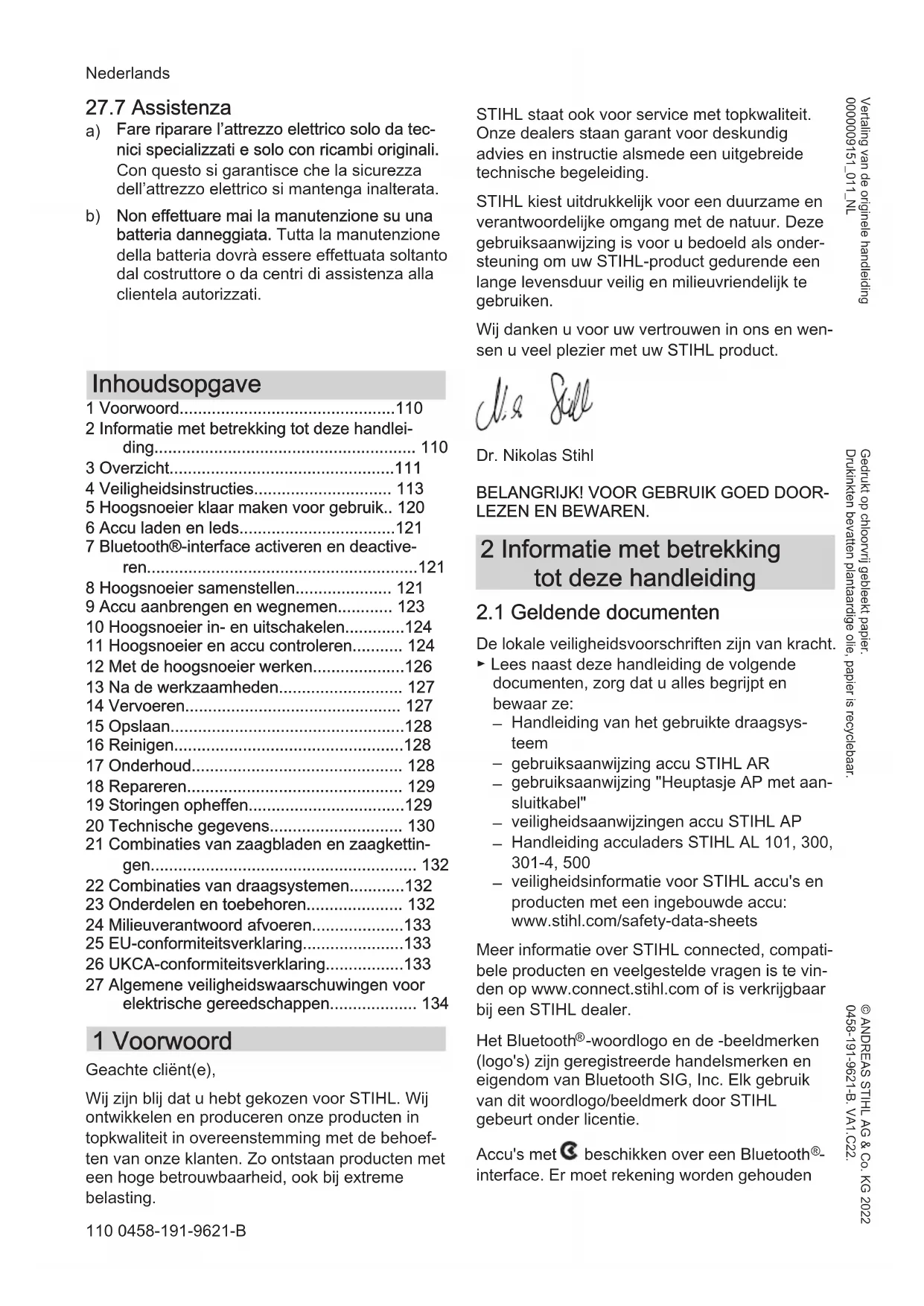- 27 Algemene veiligheidswaarschuwingen voor elektrische gereedschappen 1 Voorwoord Geachte cliënt(e), Wij zijn blij dat u hebt gekozen voor STIHL. Wij ontwikkelen en produceren onze producten in topkwaliteit in overeenstemming met de behoef‐ ten van onze klanten. Zo ontstaan producten met een hoge betrouwbaarheid, ook bij extreme belasting. STIHL staat ook voor service met topkwaliteit. Onze dealers staan garant voor deskundig advies en instructie alsmede een uitgebreide technische begeleiding. STIHL kiest uitdrukkelijk voor een duurzame en verantwoordelijke omgang met de natuur. Deze gebruiksaanwijzing is voor u bedoeld als onder‐ steuning om uw STIHL-product gedurende een lange levensduur veilig en milieuvriendelijk te gebruiken. Wij danken u voor uw vertrouwen in ons en wen‐ sen u veel plezier met uw STIHL product. Dr. Nikolas Stihl p. 134