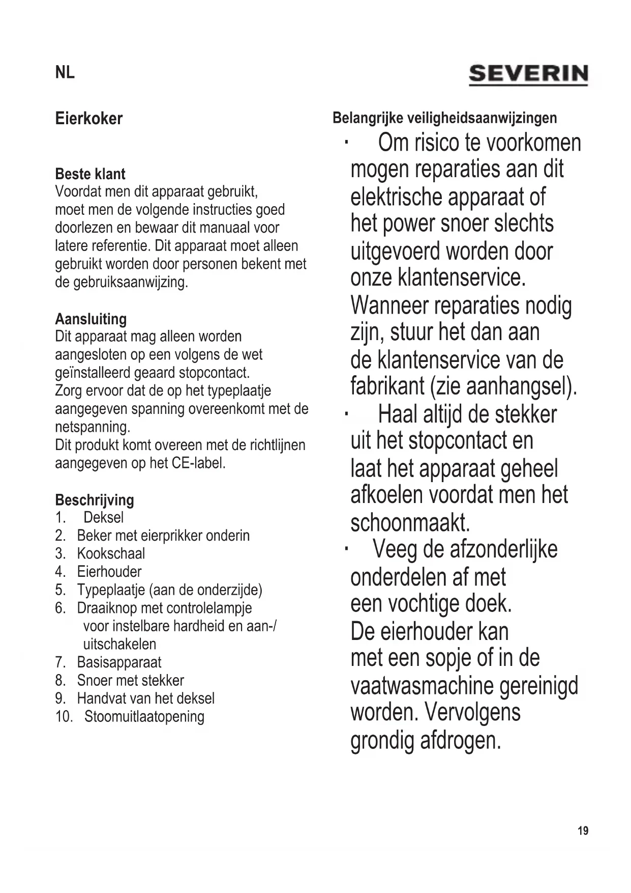 Belangrijke veiligheidsaanwijzingen ∙ Om risico te voorkomen mogen reparaties aan dit elektrische apparaat of het power snoer slechts uitgevoerd worden door onze klantenservice. Wanneer reparaties nodig zijn, stuur het dan aan de klantenservice van de fabrikant (zie aanhangsel). ∙ Haal altijd de stekker uit het stopcontact en laat het apparaat geheel afkoelen voordat men het schoonmaakt. ∙ Veeg de afzonderlijke onderdelen af met een vochtige doek. De eierhouder kan met een sopje of in de vaatwasmachine gereinigd worden. Vervolgens grondig afdrogen. NL20 104 x 142 mm ∙ Voor uitvoerige informatie over het schoonmaken van het apparaat, raadpleeg de sectie Onderhoud en schoonmaken. ∙ Om elektrische schokken te voorkomen, maak de eierkoker niet schoon met water en dompel het nooit onder. ∙ Dit apparaat is bestemd voor huishoudelijk of gelijkwaardig gebruik, zoals - in bedrijfskeukens, in winkels, kantoren of andere bedrijfsruimtes, - in agrarische instellingen, - door klanten in hotels, motels enz. en gelijkwaardige accommodaties, - in bed and breakfast gasthuizen. ∙ Voorzichtig! Bij het hanteren van de eierprikker. ∙ Waarschuwing! De buitenkant en kookschaal worden heet tijdens het gebruik en zullen dat nog enige tijd daarna blijven. Pak het warme apparaat alleen vast bij de handgreep. ∙ Waarschuwing! Hete stoom kan via de deksel uitgestoten worden. ∙ Waarschuwing! Gebruik van een defect apparaat kan letsel veroorzaken. ∙ Dit apparaat mag worden gebruikt door kinderen vanaf 8 jaar en door personen met verminderde lichamelijke, zintuiglijke of geestelijke vermogens of gebrek aan ervaring en/of kennis, mits ze onder begeleiding zijn of de instructies hebben ontvangen en de gevaren en veiligheidsvoorschriften104 x 142 mm