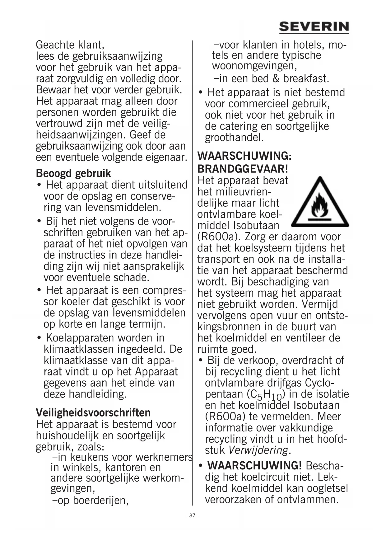 - Het apparaat is niet bestemd voor commercieel gebruik, ook niet voor het gebruik in de catering en soortgelijke groothandel. WAARSCHUWING: BRANDGGEVAAR! Het apparaat bevat het milieuvrien- delijke maar licht ontvlambare koel- middel Isobutaan (R600a). Zorg er daarom voor dat het koelsysteem tijdens het transport en ook na de installa- tie van het apparaat beschermd wordt. Bij beschadiging van het systeem mag het apparaat niet gebruikt worden. Vermijd vervolgens open vuur en ontste- kingsbronnen in de buurt van het koelmiddel en ventileer de ruimte goed.