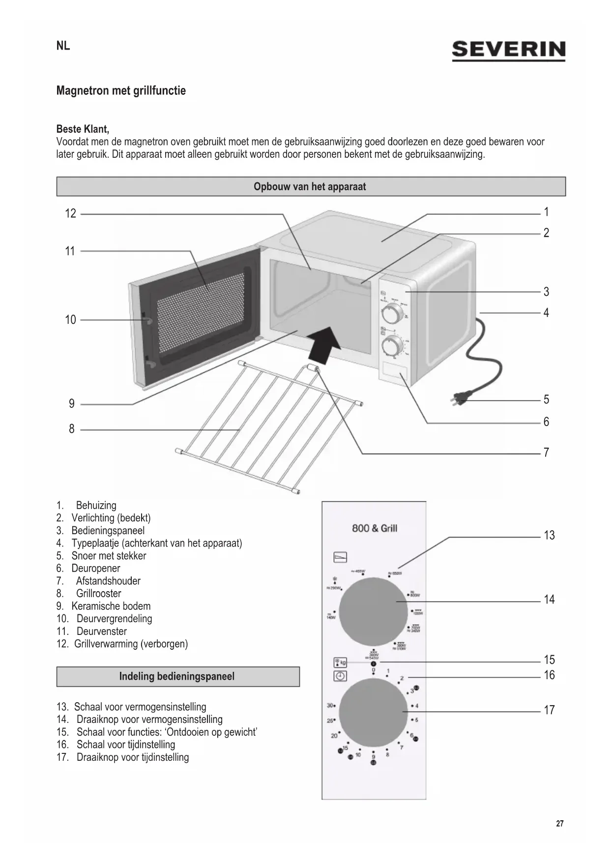 Let op: De buitenkant van dit apparaat kan zeer heet worden tijdens gebruik. Er kan stoom uitgestoten worden via de ventilatiegaten: gevaar voor verbranding. ∙ Laat het apparaat eerst voldoende afkoelen, voordat het wordt getransporteerd. ∙ Plaats het apparaat nooit op een hete ondergrond of in de buurt van open vuur of brandbare gassen. ∙ Zorg dat het snoer niet in aanraking komt met een hete ondergrond. Laat het snoer nooit los hangen. ∙ Wanneer de unit niet goed schoongemaakt wordt, zal de kwaliteit van de oppervlakken verminderen, met mogelijk als gevolg een verkorting van de levensduur evenals mogelijk gevaar voor de gebruiker. Reinig de deurafdichtingen,30 142 x 208 mm de bereidingsruimte met de keramische bodem en de aangrenzende onderdelen na elk gebruik met een vochtige doek. Voor uitvoerige informatie over het schoonmaken van het apparaat, de paragraaf Schoonmaken raadplegen. ∙ Het apparaat mag niet worden gereinigd met een stoomcleaner. ∙ Dit apparaat is bestemd voor huishoudelijk of gelijkwaardig gebruik, zoals - in bedrijfskeukens, in winkels, kantoren of andere bedrijfsruimtes, - in agrarische instellingen, - door klanten in hotels, motels enz. en gelijkwaardige accommodaties, - in bed and breakfast gasthuizen. ∙ Waarschuwing! Ieder onderhoud- of reparatiewerk dat aan de combimagnetron gedaan wordt waarbij men de beschermende platen moet verwijderen, is zeer gevaarlijk voor ongetrainde personen. Dit is inclusief de vernieuwing van het speciale snoer of het verwisselen van de binnenlamp. De magnetron mag nooit opengeschroefd worden behalve door getraind personeel. Indien dit apparaat kapot is, stuur het dan op aan de klantenservice van de fabrikant. Het adres staat vermeld op de garantiekaart. ∙ Wanneer men vloeistoffen opwarmt in de combimagnetron kan de vloeistof het kookpunt bereiken zonder dat dit zichtbaar wordt. Het is daarom erg belangrijk dat men zeer voorzichtig is met het aanpakken van bakjes tijdens het verwijderen ervan uit het apparaat. Om overkoken te voorkomen, kan men een hittebestendige glazen staaf in een bakje plaatsen tijdens het verhittingsproces. ∙ Eieren in hun schaal of heel hard gekookte eieren mag men nooit in de combimagnetron opwarmen. Er is een grote kans dat deze exploderen zelfs als het opwarmingsproces al klaar is. ∙ Waarschuwing! Het is ook zeer gevaarlijk om vloeistoffen of vast voedsel op te warmen in afgesloten bakjes omdat ook hier het gevaar voor explosie zeer groot is. ∙ De inhoud van babyessen of van glazen potjes met babyvoedsel moet goed geroerd of geschud worden om ervoor te zorgen dat de warmte gelijkmatig verdeeld wordt. Om pijn en gevaarlijke verbranding te voorkomen, moet men altijd eerst de temperatuur controleren voordat men het kind het eten geeft. ∙ Wanneer men voedsel opwarmt of kookt dat verpakt is in brandbare materialen zoals plastic of papier, dan bestaat er gevaar dat deze materialen ontbranden. Het is tevens mogelijk dat voedsel uitdroogt of ontbrandt wanneer de gekozen kooktijd te lang is. Vet en olie zijn ook zeer brandbare stoffen. Het is daarom zeer belangrijk om bij het apparaat te blijven wanneer het in gebruik is. Zeer brandbare stoffen zoals geconcentreerde alcohol mogen natuurlijk nooit verhit worden. ∙ Wanneer er rook zichtbaar is tijdens gebruik, moet men de deur gesloten houden31 142 x 208 mm om eventuele vlammen te doven. Schakel het apparaat onmiddellijk uit en haal de stekker uit het stopcontact. ∙ Gebruik bij het verwijderen van de etenswaren uit de magnetron geschikte pannenlappen. Niet alleen in de grillstand wordt het serviesgoed heet, maar ook in de magnetron, omdat de hete etenswaren ook het serviesgoed verwarmen. ∙ Speciale voedselthermometers (zoals gebruikt in gewone bakovens) zijn niet geschikt voor gebruik in magnetrons. Voor het eerste gebruik ∙ Controleer na het uitpakken en elke keer wanneer men het apparaat aansluit op het stopcontact, het apparaat en het snoer op eventuele beschadigingen. ∙ Waarschuwing! Zorg ervoor dat de deur (inclusief het kijkvenster, de deurafdichting en de deursluitingen) niet beschadigd of verbogen zijn en sluit de deur stevig in het deurframe. Dit is belangrijk om te voorkomen dat er geen microgolven vrijkomen tijdens het gebruik. Tevens moet men de behuizing van buiten en van binnen controleren om dezelfde redenen. In geval van schade dit apparaat niet gebruiken totdat het gerepareerd is door een gekwaliceerde monteur. ∙ Verwijder al het pakmateriaal aan de buiten en binnenkant. Het typeplaatje mag niet worden verwijderd. Al deze materialen zijn geschikt voor recycling. ∙ Verwijder de rubberdoppen op het grillrooster niet! Plaats de grill zo dat de ronde afstandhouder met de rubberen dop naar de achterkant van de kookruimte wijst. ∙ Waarschuwing: Houdt kinderen weg van inpakmateriaal, daar deze een bron van gevaar zijn bv. door verstikking. ∙ Voordat men het apparaat voor het eerst gebruikt of wanneer men het apparaat voor lange periode niet gebruikt heeft, moet men deze eerst goed schoonmaken zoals staat beschreven in de paragraaf Schoonmaken. ∙ Let op: Schakel het apparaat nooit aan tenzij het voedsel dat men wil koken of opwarmen in de combimagnetron geplaatst is. Gebruik van dit apparaat wanneer het leeg is, kan schade veroorzaken aan het apparaat. ∙ Het apparaat bij de eerste ingebruikname in de grillstand (zonder magnetron!) gedurende 10 minuten verwarmen. Hierbij kan een lichte geur ontstaan, dus zorg voor voldoende ventilatie door ramen of balkondeuren open te zetten. ISM-apparaat Dit product is een ISM-apparaat van groep 2 klasse B. Groep 2 omvat alle ISM-apparaten (industrieel, wetenschappelijk en medisch) waarin radiofrequentie-energie ontstaat en/of in de vorm van elektromagnetische straling wordt gebruikt voor het bewerken van materialen, alsmede vonkerosieapparaten. Klasse B omvat apparaten voor huishoudelijk gebruik of apparaten aan elektriciteitsnetten, die residentiële gebouwen van stroom voorzien. 
