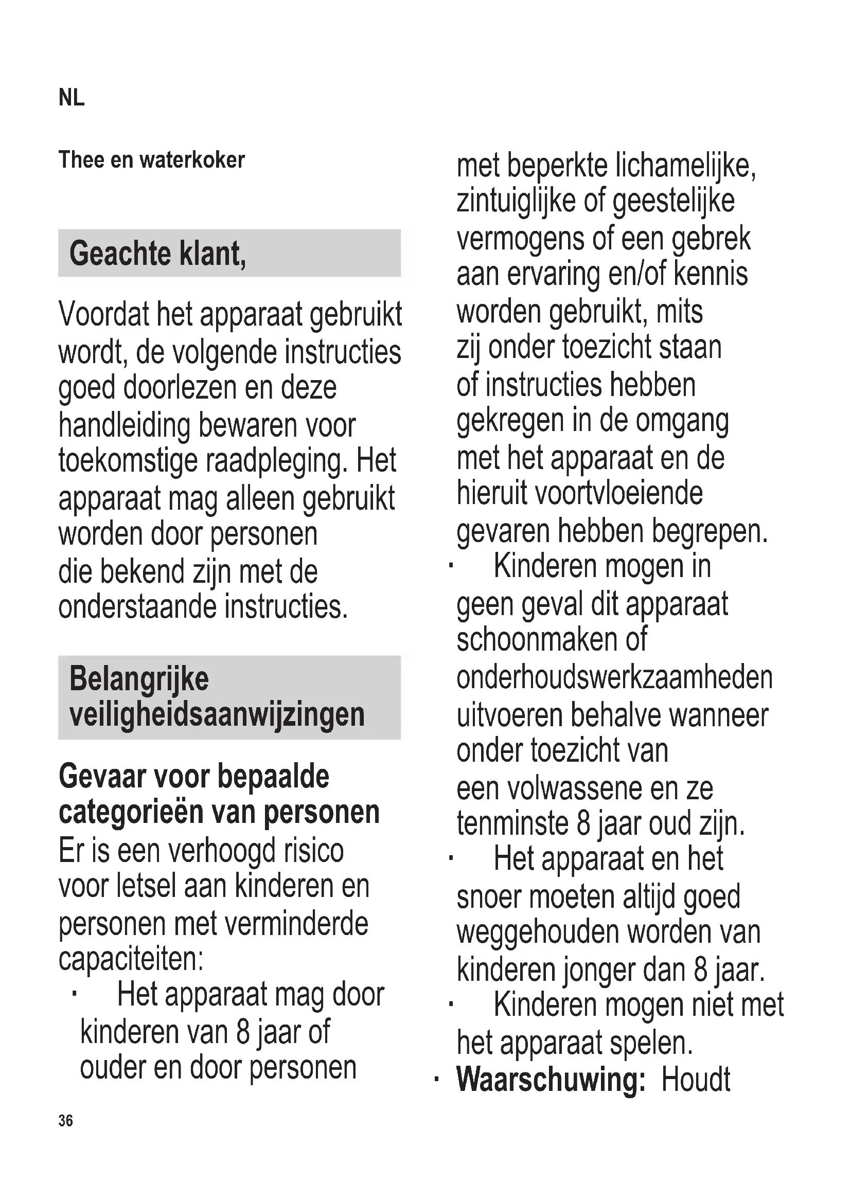 Tension de service 220-240 V~, 50-60 Hz Puissance 900 - 1100 W Dimensions (L x H x P) 17,5 x 19,5 x 10,5 cm Poids 1,0 kg Marquages particuliers Ne pas jeter avec les ordures ménagères Ce produit est en conformité avec toutes les directives relatives au marquage “CE”. UNLOCK Déverrouillage du système de verrouillage du couvercle LOCK Verrouillage du système de verrouillage du couvercle36 104 x 142 mm Thee en waterkoker Geachte klant, Voordat het apparaat gebruikt wordt, de volgende instructies goed doorlezen en deze handleiding bewaren voor toekomstige raadpleging. Het apparaat mag alleen gebruikt worden door personen die bekend zijn met de onderstaande instructies. Belangrijke veiligheidsaanwijzingen Gevaar voor bepaalde categorieën van personen Er is een verhoogd risico voor letsel aan kinderen en personen met verminderde capaciteiten: ∙ Het apparaat mag door kinderen van 8 jaar of ouder en door personen met beperkte lichamelijke, zintuiglijke of geestelijke vermogens of een gebrek aan ervaring en/of kennis worden gebruikt, mits zij onder toezicht staan of instructies hebben gekregen in de omgang met het apparaat en de hieruit voortvloeiende gevaren hebben begrepen. ∙ Kinderen mogen in geen geval dit apparaat schoonmaken of onderhoudswerkzaamheden uitvoeren behalve wanneer onder toezicht van een volwassene en ze tenminste 8 jaar oud zijn. ∙ Het apparaat en het snoer moeten altijd goed weggehouden worden van kinderen jonger dan 8 jaar. ∙ Kinderen mogen niet met het apparaat spelen. ∙ Waarschuwing: Houdt NL104 x 142 mm