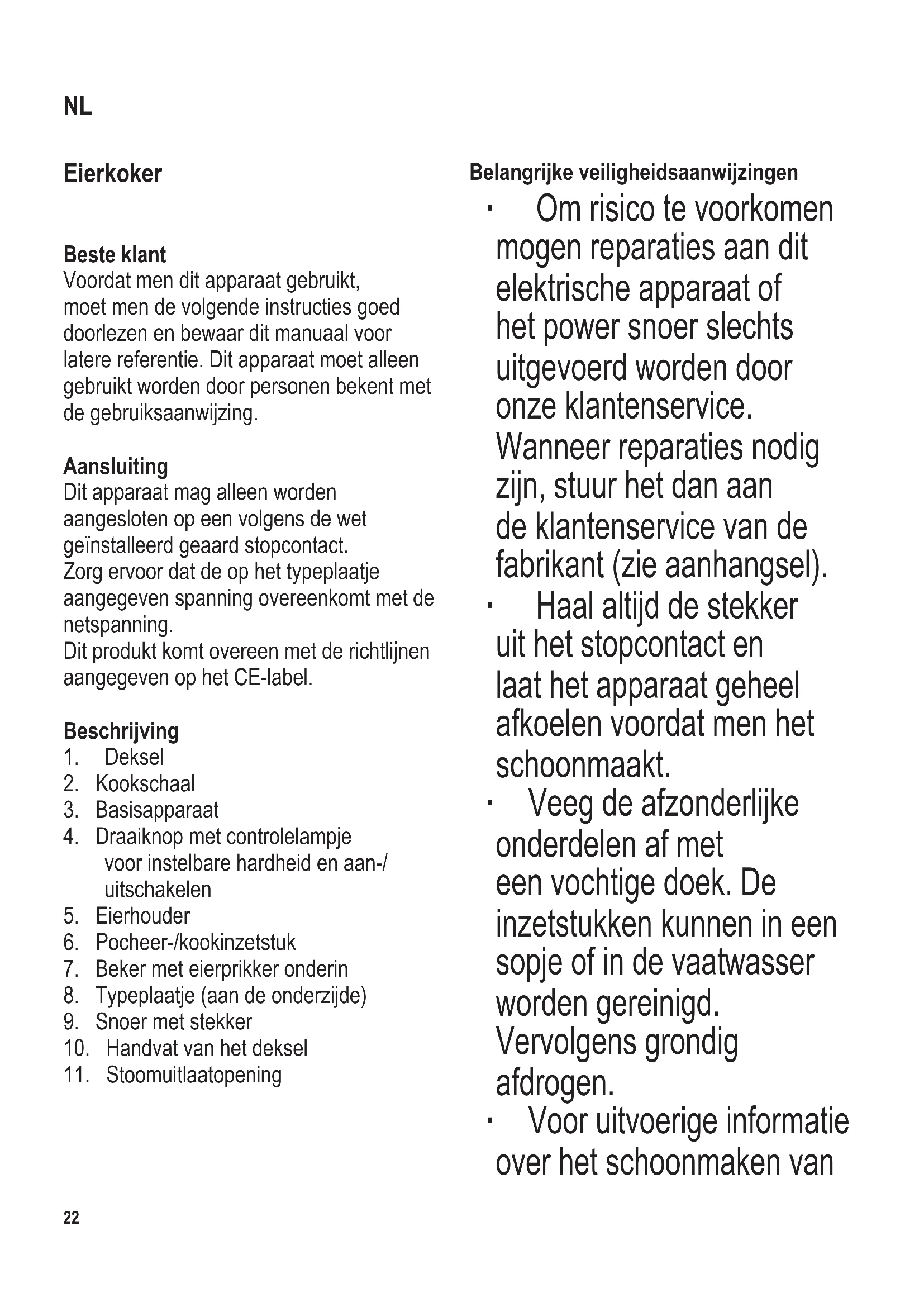 het apparaat, raadpleeg de sectie Onderhoud en schoonmaken. ∙ Om elektrische schokken te voorkomen, maak de eierkoker niet schoon met water en dompel het nooit onder. ∙ Dit apparaat is bestemd voor huishoudelijk of gelijkwaardig gebruik, zoals - in bedrijfskeukens, in winkels, kantoren of andere bedrijfsruimtes, - in agrarische instellingen, - door klanten in hotels, motels enz. en gelijkwaardige accommodaties, - in bed and breakfast gasthuizen. ∙ Voorzichtig! Bij het hanteren van de eierprikker. ∙ Waarschuwing! De buitenkant en kookschaal worden heet tijdens het gebruik en zullen dat nog enige tijd daarna blijven. Pak het warme apparaat alleen vast bij de handgreep. ∙ Waarschuwing! Hete stoom kan via de deksel uitgestoten worden. ∙ Waarschuwing! Gebruik van een defect apparaat kan letsel veroorzaken. ∙ Dit apparaat mag worden gebruikt door kinderen vanaf 8 jaar en door personen met verminderde lichamelijke, zintuiglijke of geestelijke vermogens of gebrek aan ervaring en/of kennis, mits ze onder begeleiding zijn of de instructies hebben ontvangen en de gevaren en veiligheidsvoorschriften volledig begrijpen. ∙ Kinderen mogen niet met24 104 x 142 mm het apparaat spelen. ∙ Kinderen mogen in geen geval dit apparaat schoonmaken of onderhoudswerkzaamheden uitvoeren behalve wanneer onder toezicht van een volwassene en ze tenminste 8 jaar oud zijn. ∙ Het apparaat en het netsnoer moeten altijd goed weggehouden worden van kinderen jonger dan 8 jaar. ∙ Waarschuwing: Houdt kinderen weg van inpakmateriaal daar dit een bron van gevaar zijn voor bijv. verstikking. ∙ Voordat het apparaat wordt gebruikt moet zowel de hoofdeenheid inclusief het netsnoer als welk ander hulpstuk dat wordt aangebracht, eerst zorgvuldig op eventuele defecten worden gecontroleerd. Ingeval het apparaat, bijvoorbeeld, op een hard oppervlak is gevallen, of wanneer men met overdadige kracht aan het netsnoer getrokken heeft, mag men het niet meer gebruiken: zelfs onzichtbare beschadiging kan ongewenste effecten hebben op de gebruiksveiligheid van het apparaat. In dit geval kunt u contact opnemen met onze klantenservice. ∙ Laat dit apparaat tijdens gebruik nooit onbeheerd achter. ∙ Houdt het netsnoer uit de buurt van hete apparaatdelen en wikkel het niet om het nog warme apparaat. ∙ Verwijder altijd de stekker uit het stopcontact: - wanneer het apparaat niet werkt, - na gebruik, - wanneer men het apparaat schoonmaakt. ∙ Trek de stekker niet aan het snoer uit het stopcontact, trek aan de stekker zelf. ∙ Tijdens gebruik moet men het apparaat op een vlak oppervlak plaatsen wat hitte- en vochtbestendig is. ∙ Plaats het apparaat niet op of bij hete oppervlaktes of open vuur zoals kookplaten of gasvlammen. Gebruik het apparaat niet onder gevoelige voorwerpen of meubels, zoals keukenkastjes, daar hete stoom door de deksel wordt uitgestoten tijdens gebruik. ∙ Wordt dit apparaat op een verkeerde manier gebruikt of worden de veiligheidsregels niet gevolgd, dan kan de fabrikant niet aansprakelijk worden gesteld voor eventuele schades. Voor de eerste ingebruikname ∙ Pak het apparaat uit en verwijder al het verpakkingsmateriaal en eventuele reclamestickers. Het typeplaatje mag niet worden verwijderd. ∙ Het apparaat één keer met de eierenhouder, maar zonder eieren, met de instelling /medium gebruiken, zoals onder ‘Bediening’ staat beschreven. ∙ Maak het pocheer-/kookinzetstuk schoon in een sopje en droog het af.104 x 142 mm