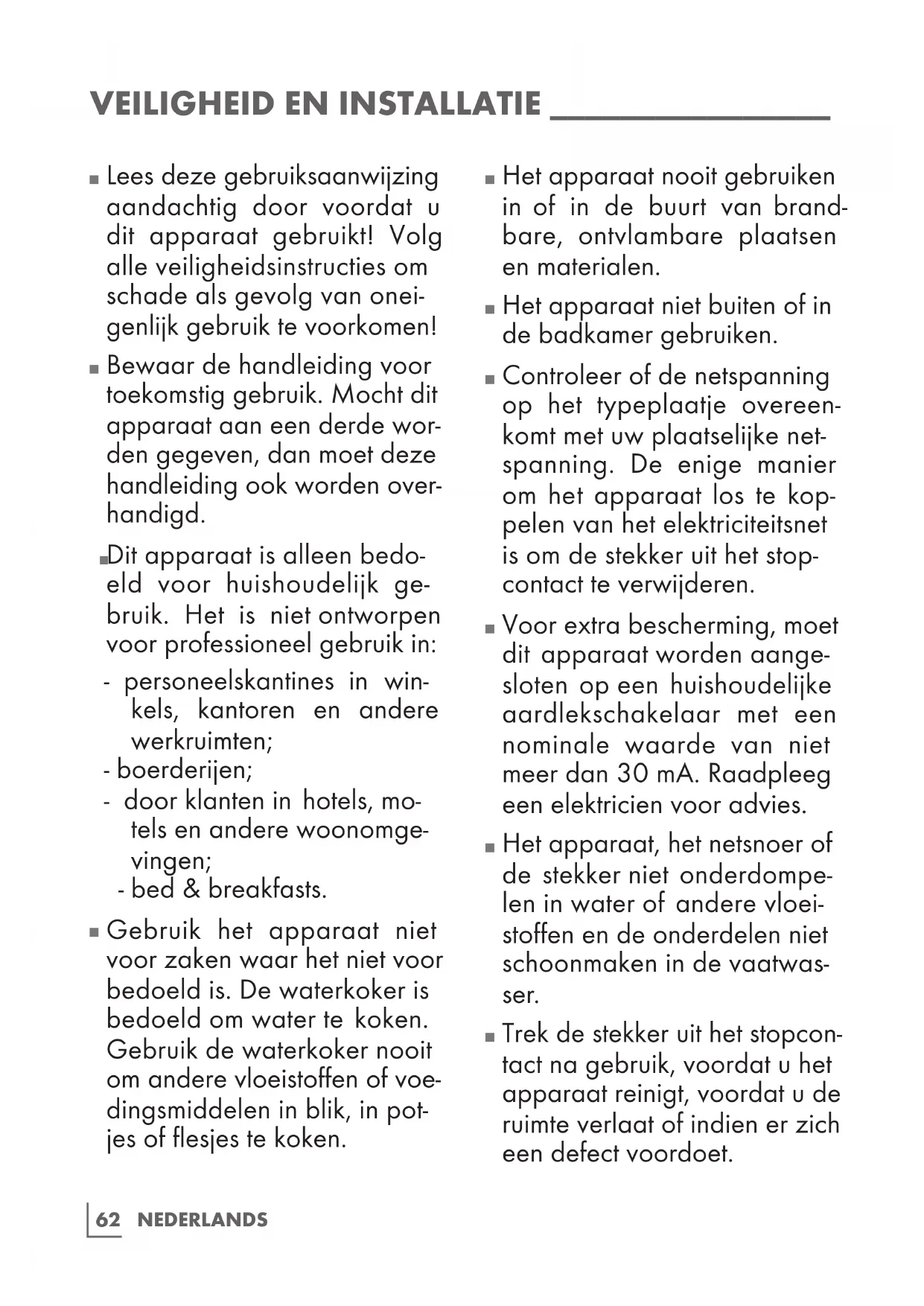 Gebruik het apparaat niet voor zaken waar het niet voor bedoeld is. De waterkoker is bedoeld om water te koken. Gebruik de waterkoker nooit om andere vloeistoffen of voe- dingsmiddelen in blik, in pot- jes of flesjes te koken.