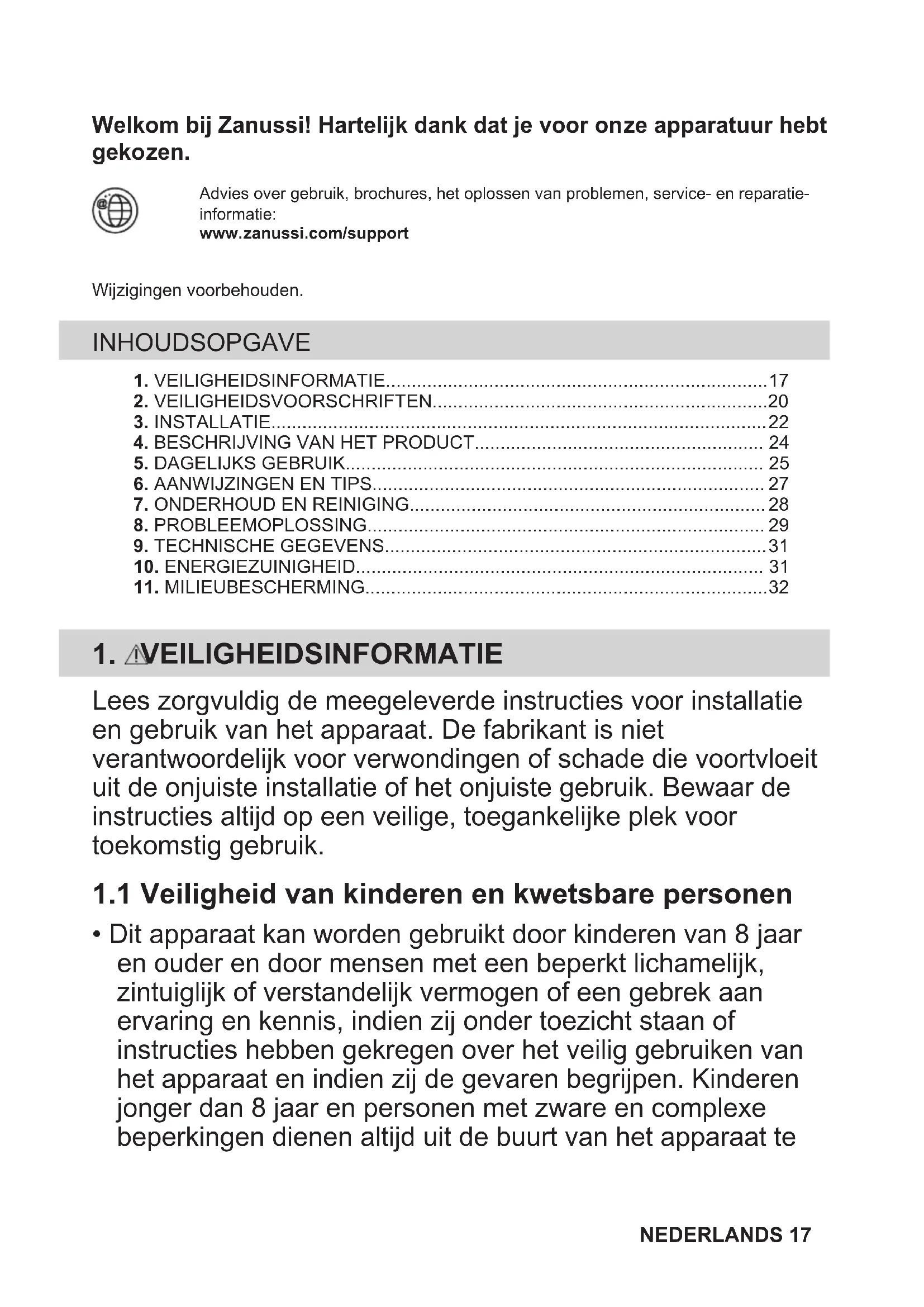 Recycleer de materialen met het symbool . Gooi de verpakking in een geschikte afvalcontainer om het te recycleren. Bescherm het milieu en de volksgezondheid en recycleer op een correcte manier het afval van elektrische en elektronische apparaten. Gooi apparaten gemarkeerd met het symbool niet weg met het huishoudelijk afval. Breng het product naar het milieustation bij u in de buurt of neem contact op met de gemeente. 32 NEDERLANDSWelcome to Zanussi! Thank you for choosing our appliance. Get usage advice, brochures, trouble shooter, service and repair information:www.zanussi.com/supportSubject to change without notice. CONTENTS
