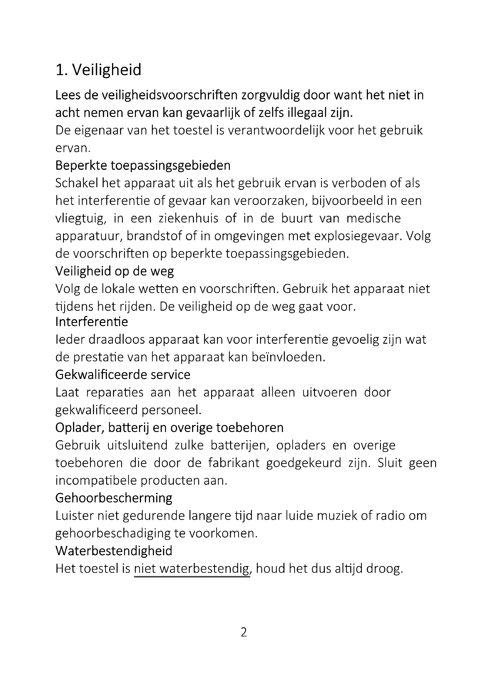 Lees de veiligheidsvoorschriften zorgvuldig door want het niet in acht nemen ervan kan gevaarlijk of zelfs illegaal zijn. De eigenaar van het toestel is verantwoordelijk voor het gebruik ervan. Beperkte toepassingsgebieden Schakel het apparaat uit als het gebruik ervan is verboden of als het interferentie of gevaar kan veroorzaken, bijvoorbeeld in een vliegtuig, in een ziekenhuis of in de buurt van medische apparatuur, brandstof of in omgevingen met explosiegevaar. Volg de voorschriften op beperkte toepassingsgebieden. Veiligheid op de weg Volg de lokale wetten en voorschriften. Gebruik het apparaat niet tijdens het rijden. De veiligheid op de weg gaat voor. Interferentie Ieder draadloos apparaat kan voor interferentie gevoelig zijn wat de prestatie van het apparaat kan beïnvloeden. Gekwalificeerde service Laat reparaties aan het apparaat alleen uitvoeren door gekwalificeerd personeel. Oplader, batterij en overige toebehoren Gebruik uitsluitend zulke batterijen, opladers en overige toebehoren die door de fabrikant goedgekeurd zijn. Sluit geen incompatibele producten aan. Gehoorbescherming Luister niet gedurende langere tijd naar luide muziek of radio om gehoorbeschadiging te voorkomen. Waterbestendigheid Het toestel is niet waterbestendig, houd het dus altijd droog.3 Gebruiksomgeving Het apparaat voldoet aan de aanbevolen waardes voor het uitzenden van radiogolven indien het van het oor op een afstand van minstens 1,5 cm gehouden wordt. Indien de telefoon in een telefoonhoesje, met riemgesp of in een houder bewaard wordt, zorg ervoor dat deze geen metalen bevatten en dat de telefoon daardoor een beetje van het lichaam verwijderd is. In geval van gebruik van andere accessoires kan het functioneren conform de richtlijnen inzake radiogolven niet gegarandeerd worden. Indien u geen telefoonhoesje gebruikt en de telefoon niet aan uw oor houdt, houd het apparaat minstens op een afstand van 2,5 cm van uw lichaam, met name bij dataverzending.