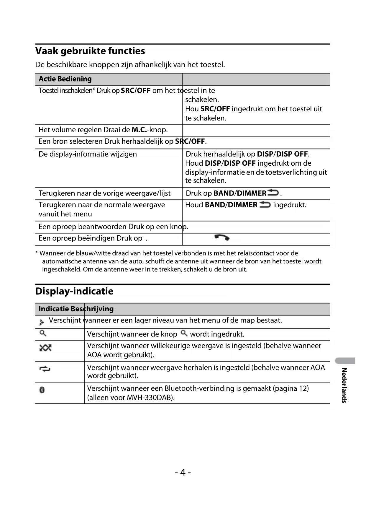 - Wanneer de blauw/witte draad van het toestel verbonden is met het relaiscontact voor de automatische antenne van de auto, schuift de antenne uit wanneer de bron van het toestel wordt ingeschakeld. Om de antenne weer in te trekken, schakelt u de bron uit. Display-indicatie Actie Bediening Toestel inschakelen* Druk op SRC/OFF om het toestel in te schakelen. Hou SRC/OFF ingedrukt om het toestel uit te schakelen. Het volume regelen Draai de M.C.-knop. Een bron selecteren Druk herhaaldelijk op SRC/OFF. De display-informatie wijzigen Druk herhaaldelijk op DISP/DISP OFF. Houd DISP/DISP OFF ingedrukt om de display-informatie en de toetsverlichting uit te schakelen. Terugkeren naar de vorige weergave/lijst Druk op BAND/DIMMER . Terugkeren naar de normale weergave vanuit het menu Houd BAND/DIMMER ingedrukt. Een oproep beantwoorden Druk op een knop. Een oproep beëindigen Druk op . Indicatie Beschrijving Verschijnt wanneer er een lager niveau van het menu of de map bestaat. Verschijnt wanneer de knop wordt ingedrukt. Verschijnt wanneer willekeurige weergave is ingesteld (behalve wanneer AOA wordt gebruikt). Verschijnt wanneer weergave herhalen is ingesteld (behalve wanneer AOA wordt gebruikt). Verschijnt wanneer een Bluetooth-verbinding is gemaakt (pagina 12) (alleen voor MVH-330DAB).- 5 -- 5 - Nederlands Verwijder het voorpaneel om diefstal te voorkomen. Verwijder alle kabels en apparaten die verbonden zijn met het voorpaneel en schakel het toestel uit voor u het voorpaneel verwijdert. Belangrijk