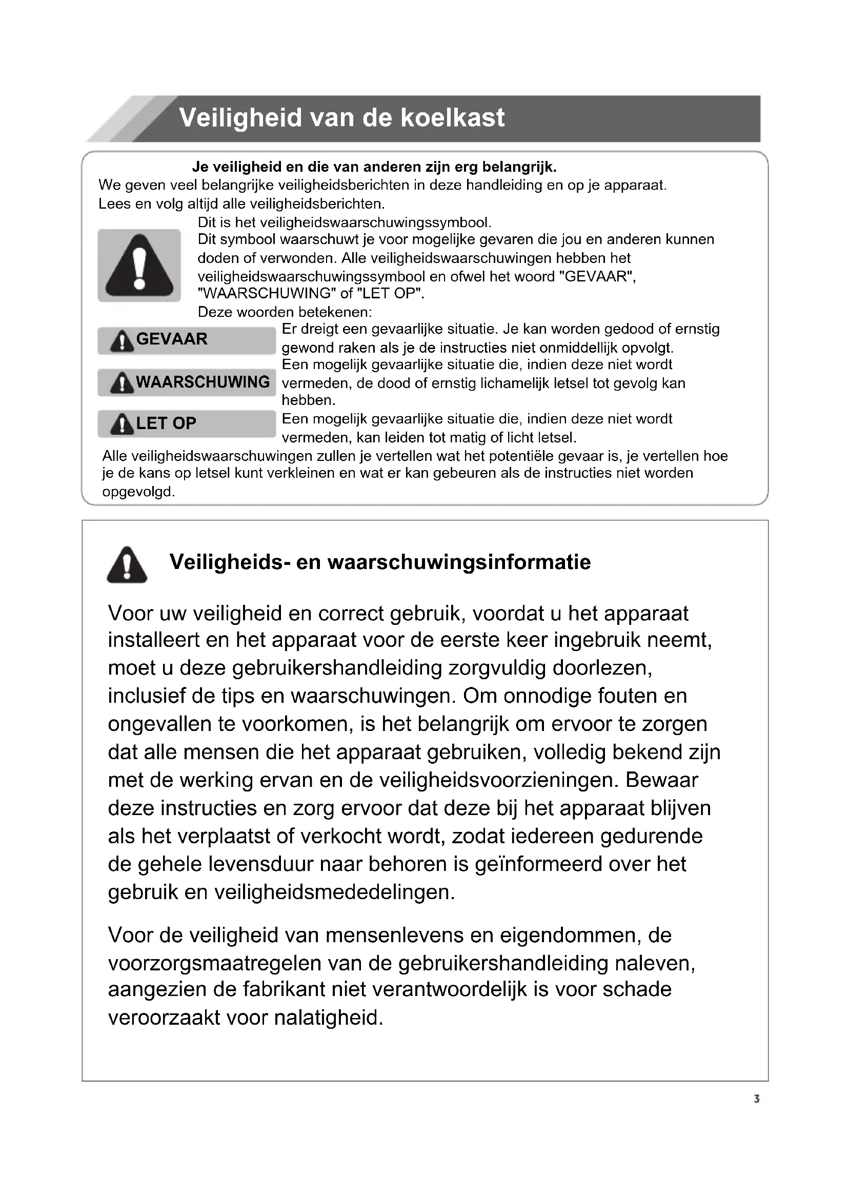 - PROBLEEMOPLOSSING Veiligheid van de koelkast Je veiligheid en die van anderen zijn erg belangrijk. We geven veel belangrijke veiligheidsberichten in deze handleiding en op je apparaat. Lees en volg altijd alle veiligheidsberichten. Dit is het veiligheidswaarschuwingssymbool. Dit symbool waarschuwt je voor mogelijke gevaren die jou en anderen kunnen doden of verwonden. Alle veiligheidswaarschuwingen hebben het veiligheidswaarschuwingssymbool en ofwel het woord "GEVAAR", "WAARSCHUWING" of "LET OP". Deze woorden betekenen: GEVAAR Er dreigt een gevaarlijke situatie. Je kan worden gedood of ernstig gewond raken als je de instructies niet onmiddellijk opvolgt. Een mogelijk gevaarlijke situatie die, indien deze niet wordt vermeden, de dood of ernstig lichamelijk letsel tot gevolg kan hebben. Een mogelijk gevaarlijke situatie die, indien deze niet wordt vermeden, kan leiden tot matig of licht letsel. Alle veiligheidswaarschuwingen zullen je vertellen wat het potentiële gevaar is, je vertellen hoe je de kans op letsel kunt verkleinen en wat er kan gebeuren als de instructies niet worden opgevolgd. Veiligheids- en waarschuwingsinformatie Voor uw veiligheid en correct gebruik, voordat u het apparaat installeert en het apparaat voor de eerste keer ingebruik neemt, moet u deze gebruikershandleiding zorgvuldig doorlezen, inclusief de tips en waarschuwingen. Om onnodige fouten en ongevallen te voorkomen, is het belangrijk om ervoor te zorgen dat alle mensen die het apparaat gebruiken, volledig bekend zijn met de werking ervan en de veiligheidsvoorzieningen. Bewaar deze instructies en zorg ervoor dat deze bij het apparaat blijven als het verplaatst of verkocht wordt, zodat iedereen gedurende de gehele levensduur naar behoren is geïnformeerd over het gebruik en veiligheidsmededelingen. Voor de veiligheid van mensenlevens en eigendommen, de voorzorgsmaatregelen van de gebruikershandleiding naleven, aangezien de fabrikant niet verantwoordelijk is voor schade veroorzaakt voor nalatigheid. WAARSCHUWING LET OPVeiligheid voor kinderen en anderen personen die kwetsbaar zijn In overeenstemming met de EN-norm Dit apparaat kan door kinderen van 8 jaar en ouder en personen met verminderde fysieke, sensorische of mentale capaciteiten of gebrek aan ervaring en kennis worden gebruikt als zij op een veilige manier geïnstrueerd zijn over het gebruik van het apparaat en de betrokken gevaren hebben begrepen. Kinderen mogen niet met het apparaat spelen. Reinigings- en onderhoudswerkzaamheden mag niet zonder toezicht door kinderen worden gedaan. Kinderen in de leeftijd van 3 tot 8 mogen in werking zijnde koelende apparaten vullen en leegmaken. In overeenstemming met de IEC-norm Dit apparaat is niet bedoeld voor gebruik door personen (inclusief kinderen) met verminderde lichamelijke, zintuiglijke of geestelijke vermogens, of gebrek aan ervaring en kennis, tenzij ze onder toezicht staan of geïnstrueerd werden over het gebruik van het apparaat door een persoon die verantwoordelijk is voor hun veiligheid. Kinderen moeten onder toezicht staan om ervoor te zorgen dat ze niet met het apparaat spelen. Houd alle verpakkingsmaterialen uit de buurt van kinderen, omdat er verstikkingsgevaar bestaat. Indien u het apparaat gaat afdanken, trekt u de stekker uit het stopcontact, snijdt het netsnoer ervan af (zo dicht mogelijk bij het apparaat) en verwijder de deur, teneinde te voorkomen dat kinderen een elektrische schokken krijgen of zichzelf in het apparaat opsluiten. Indien dit apparaat, welke is voorzien van magnetische deurafdichtingen, een ouder model van het apparaat moet vervangen die een veerslot (vergrendeling) op de deur of de deksel heeft, zorg ervoor dat het veerslot onbruikbaar wordt gemaakt voordat u het oude apparaat afdankt. Het bovenstaande zal voorkomen dat het een dodelijke valstrik voor een kind wordt.Algemene veiligheid Dit apparaat is bedoeld voor gebruik in huishoudelijke en soortgelijke toepassingen zoals: -Personeelkeukens in winkels, kantoren of andere werkomgevingen; -Boerderijen en bij klanten in hotels, motels en andere type woonomgevingen; -Bed en breakfast type omgevingen; -Catering en dergelijke niet-retail toepassingen. Geen explosieve stoffen zoals aerosol blikjes met brandbaar drijfgas in dit apparaat bewaren. Indien het netsnoer beschadig is, moet het worden vervangen door de fabrikant, servicemonteur of gelijkwaardige gekwalificeerd persoon teneinde gevaren te voorkomen. WAARSCHUWING — Ventilatieopeningen in de behuizing van het apparaat of in een ingebouwde structuur vrij van obstakels houden. WAARSCHUWING — Gebruik geen mechanische apparaten of andere middelen om het ondooiproces te versnellen, andere dan die aanbevolen door de fabrikant. WAARSCHUWING — Gebruik geen elektrische apparaten in de opslagruimte voor levensmiddelen van het apparaat, tenzij zij van het type zijn dat wordt aanbevolen door de fabrikant. Het koelmiddel en de isolatie drijfgas zijn ontvlambaar. Als u het apparaat afdankt, doe dit alleen bij een erkend afvalverwijderingscentrum. Niet blootstellen aan vlammen. WAASCHUWING — Bij het positioneren van het apparaat moet u controleren of het netsnoer niet verstrikt of beschadigd is geraakt. WAARSCHUWING— Het waterreservoir alleen vullen met drinkwater. WAARSCHUWING — Het koelcircuit niet beschadigen.WAARSCHUWING — Niet meerdere draagbare stopcontacten of draagbare voedingen aan de achterkant van het apparaat plaatsen. Vervangen van het LED-lampje WAARSCHUWING — Het LED-lampje mag niet door de gebruiker worden vervangen.! Als het LED-lampje beschadigd is, neemt u contact op met de klantenservice voor assistentie. Koelmiddel Het koelmiddel isobuteen (R600a) bevindt zich in het koelcircuit van het apparaat, isobuteen is een natuurlijk gas met een hoge mate van milieuvriendelijkheid, maar die wel ontvlambaar is. Tijdens transport en installatie van het apparaat, moet u ervoor zorgen dat geen van de componenten van het koelcircuit beschadigd raakt. Het koelmiddel (R60