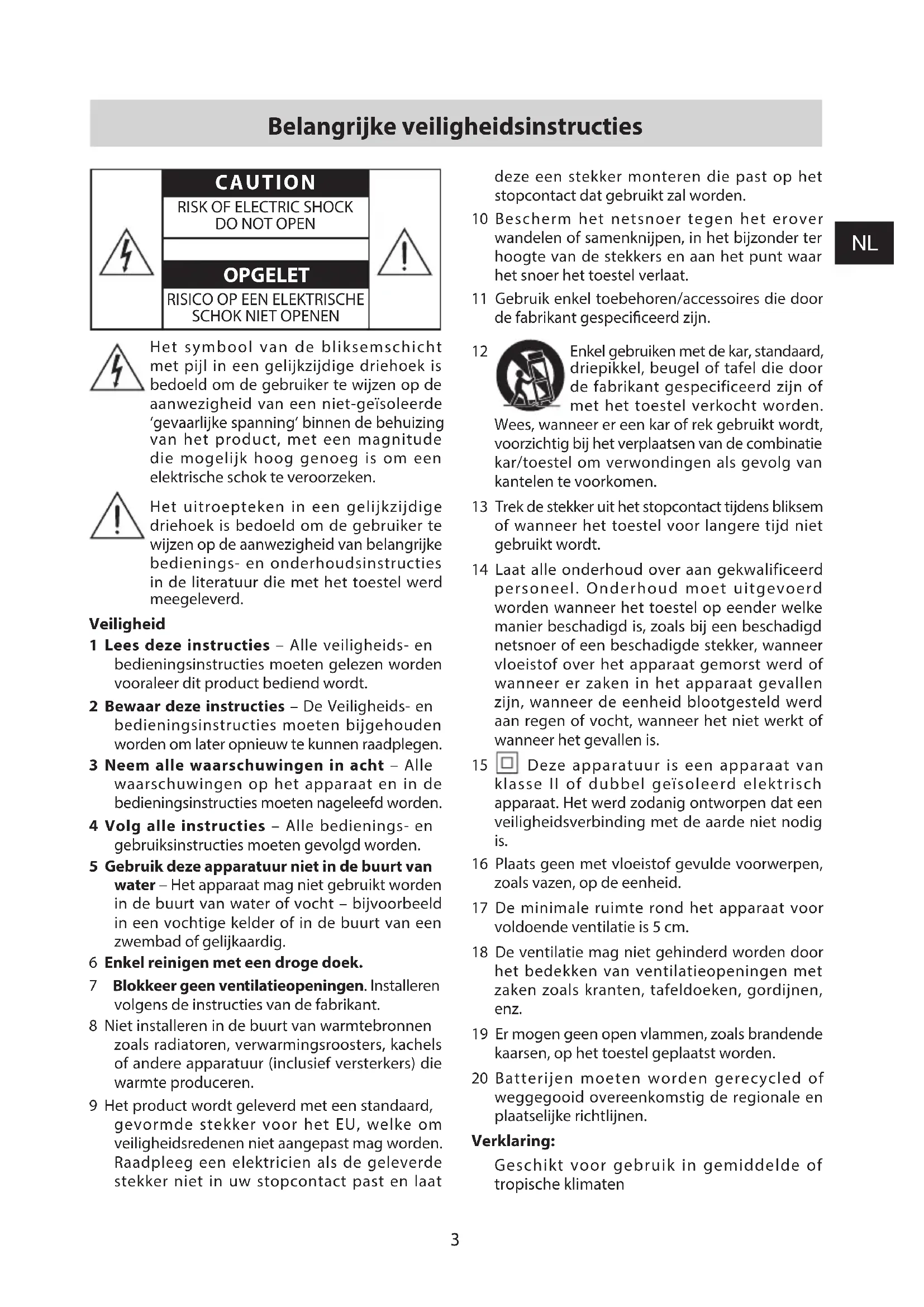 Deze apparatuur is een apparaat van klasse II of dubbel geïsoleerd elektrisch apparaat. Het werd zodanig ontworpen dat een veiligheidsverbinding met de aarde niet nodig is. 16 Plaats geen met vloeistof gevulde voorwerpen, zoals vazen, op de eenheid. 17 De minimale ruimte rond het apparaat voor voldoende ventilatie is 5 cm. 18 De ventilatie mag niet gehinderd worden door het bedekken van ventilatieopeningen met zaken zoals kranten, tafeldoeken, gordijnen, enz. 19 Er mogen geen open vlammen, zoals brandende kaarsen, op het toestel geplaatst worden. 20 Batterijen moeten worden gerecycled of weggegooid overeenkomstig de regionale en plaatselijke richtlijnen. Verklaring: Geschikt voor gebruik in gemiddelde of tropische klimaten Belangrijke veiligheidsinstructies Het symbool van de bliksemschicht met pijl in een gelijkzijdige driehoek is bedoeld om de gebruiker te wijzen op de aanwezigheid van een niet-geïsoleerde ‘gevaarlijke spanning’ binnen de behuizing van het product, met een magnitude die mogelijk hoog genoeg is om een elektrische schok te veroorzeken. Het uitroepteken in een gelijkzijdige driehoek is bedoeld om de gebruiker te wijzen op de aanwezigheid van belangrijke bedienings- en onderhoudsinstructies in de literatuur die met het toestel werd meegeleverd. Veiligheid 1 Lees deze instructies – Alle veiligheids- en bedieningsinstructies moeten gelezen worden vooraleer dit product bediend wordt. 2 Bewaar deze instructies – De Veiligheids- en bedieningsinstructies moeten bijgehouden worden om later opnieuw te kunnen raadplegen. 3 Neem alle waarschuwingen in acht – Alle waarschuwingen op het apparaat en in de bedieningsinstructies moeten nageleefd worden. 4 Volg alle instructies – Alle bedienings- en gebruiksinstructies moeten gevolgd worden. 5 Gebruik deze apparatuur niet in de buurt van water – Het apparaat mag niet gebruikt worden in de buurt van water of vocht – bijvoorbeeld in een vochtige kelder of in de buurt van een zwembad of gelijkaardig. 6 Enkel reinigen met een droge doek. 7 Blokkeer geen ventilatieopeningen. Installeren volgens de instructies van de fabrikant. 8 Niet installeren in de buurt van warmtebronnen zoals radiatoren, verwarmingsroosters, kachels of andere apparatuur (inclusief versterkers) die warmte produceren. 9 Het product wordt geleverd met een standaard, gevormde stekker voor het EU, welke om veiligheidsredenen niet aangepast mag worden. Raadpleeg een elektricien als de geleverde stekker niet in uw stopcontact past en laat CAUTION