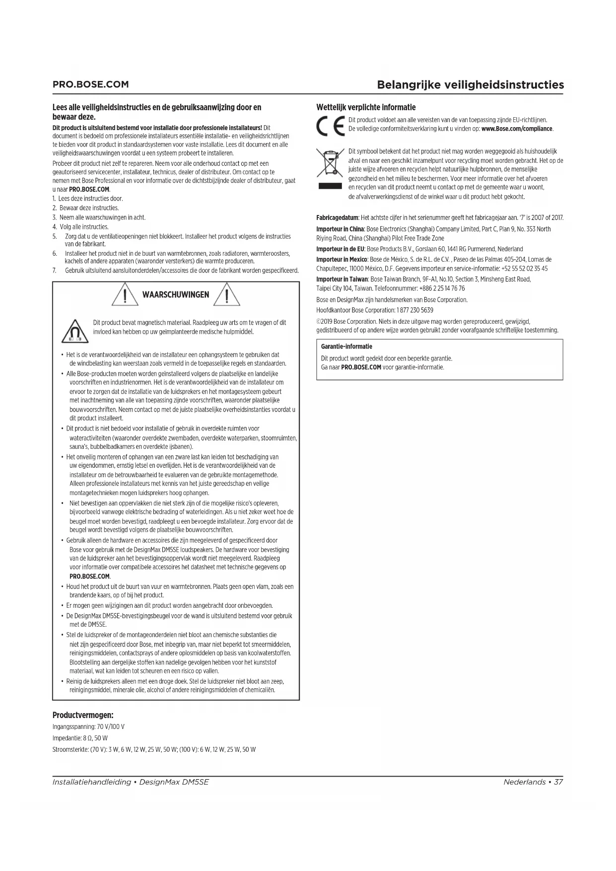 - Reinig de luidsprekers alleen met een droge doek. Stel de luidspreker niet bloot aan zeep, reinigingsmiddel, minerale olie, alcohol of andere reinigingsmiddelen of chemicaliën. Productvermogen: Ingangsspanning: 70 V/100 V Impedantie: 8 50 W Stroomsterkte: (70 V): 3 W, 6 W, 12 W, 25 W, 50 W; (100 V): 6 W, 12 W, 25 W, 50 W Wettelijk verplichte informatie Dit product voldoet aan alle vereisten van de van toepassing zijnde EU-richtlijnen. Devolledige conformiteitsverklaring kunt u vinden op: www.Bose.com/compliance. Dit symbool betekent dat het product niet mag worden weggegooid als huishoudelijk afval en naar een geschikt inzamelpunt voor recycling moet worden gebracht. Het opde juiste wijze afvoeren en recyclen helpt natuurlijke hulpbronnen, de menselijke gezondheid en het milieu te beschermen. Voor meer informatie over het afvoeren enrecyclen van dit product neemt u contact op met de gemeente waar u woont, deafvalverwerkingsdienst of de winkel waar u dit product hebt gekocht. Fabricagedatum: Het achtste cijfer in het serienummer geeft het fabricagejaar aan. ‘7’ is 2007 of2017. Importeur in China: Bose Electronics (Shanghai) Company Limited, Part C, Plan 9, No. 353 North Riying Road, China (Shanghai) Pilot Free Trade Zone Importeur in de EU: Bose Products B.V., Gorslaan 60, 1441 RG Purmerend, Nederland Importeur in Mexico: Bose de México, S. de R.L. de C.V. , Paseo de las Palmas 405-204, Lomas de Chapultepec, 11000 México, D.F. Gegevens importeur en service-informatie: +52 55 52 02 35 45 Importeur in Taiwan: Bose Taiwan Branch, 9F-A1, No.10, Section 3, Minsheng East Road, TaipeiCity104, Taiwan. Telefoonnummer: +886 2 25 14 76 76 Bose en DesignMax zijn handelsmerken van Bose Corporation. Hoofdkantoor Bose Corporation: 1 877 230 5639 ©2019 Bose Corporation. Niets in deze uitgave mag worden gereproduceerd, gewijzigd, gedistribueerd of op andere wijze worden gebruikt zonder voorafgaande schriftelijke toestemming. Garantie-informatie Dit product wordt gedekt door een beperkte garantie. Ga naar PRO.BOSE.COM voor garantie-informatie.38 • Nederlands DesignMax DM5SE • Installatiehandleiding