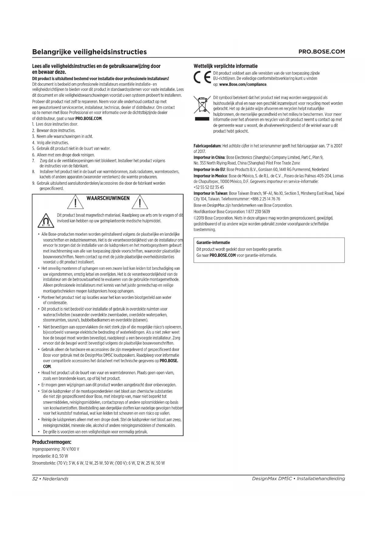 gespecificeerd. Wettelijk verplichte informatie Dit product voldoet aan alle vereisten van de van toepassing zijnde EU-richtlijnen. De volledige conformiteitsverklaring kunt u vinden op: www.Bose.com/compliance. Dit symbool betekent dat het product niet mag worden weggegooid als huishoudelijk afval en naar een geschikt inzamelpunt voor recycling moet worden gebracht. Het op de juiste wijze afvoeren en recyclen helpt natuurlijke hulpbronnen, de menselijke gezondheid en het milieu te beschermen. Voor meer informatie over het afvoeren en recyclen van dit product neemt u contact op met de gemeente waar u woont, de afvalverwerkingsdienst of de winkel waar u dit product hebt gekocht. Fabricagedatum: Het achtste cijfer in het serienummer geeft het fabricagejaar aan. ‘7’is2007 of 2017. Importeur in China: Bose Electronics (Shanghai) Company Limited, Part C, Plan 9, No. 353 North Riying Road, China (Shanghai) Pilot Free Trade Zone Importeur in de EU: Bose Products B.V., Gorslaan 60, 1441 RG Purmerend, Nederland Importeur in Mexico: Bose de México, S. de R.L. de C.V. , Paseo de las Palmas 405-204, Lomas de Chapultepec, 11000 México, D.F. Gegevens importeur en service-informatie: +52 55 52 02 35 45 Importeur in Taiwan: Bose Taiwan Branch, 9F-A1, No.10, Section 3, Minsheng East Road, Taipei City 104, Taiwan. Telefoonnummer: +886 2 25 14 76 76 Bose en DesignMax zijn handelsmerken van Bose Corporation. Hoofdkantoor Bose Corporation: 1 877 230 5639 ©2019 Bose Corporation. Niets in deze uitgave mag worden gereproduceerd, gewijzigd, gedistribueerd of op andere wijze worden gebruikt zonder voorafgaande schriftelijke toestemming. Garantie-informatie Dit product wordt gedekt door een beperkte garantie. Ga naar PRO.BOSE.COM voor garantie-informatie. Productvermogen: Ingangsspanning: 70 V/100 V Impedantie: 8 Ω, 50 W Stroomsterkte: (70 V): 3 W, 6 W, 12 W, 25 W, 50 W; (100 V): 6 W, 12 W, 25 W, 50 W WAARSCHUWINGEN Dit product bevat magnetisch materiaal. Raadpleeg uw arts om te vragen ofdit invloed kan hebben op uw geïmplanteerde medische hulpmiddel.
