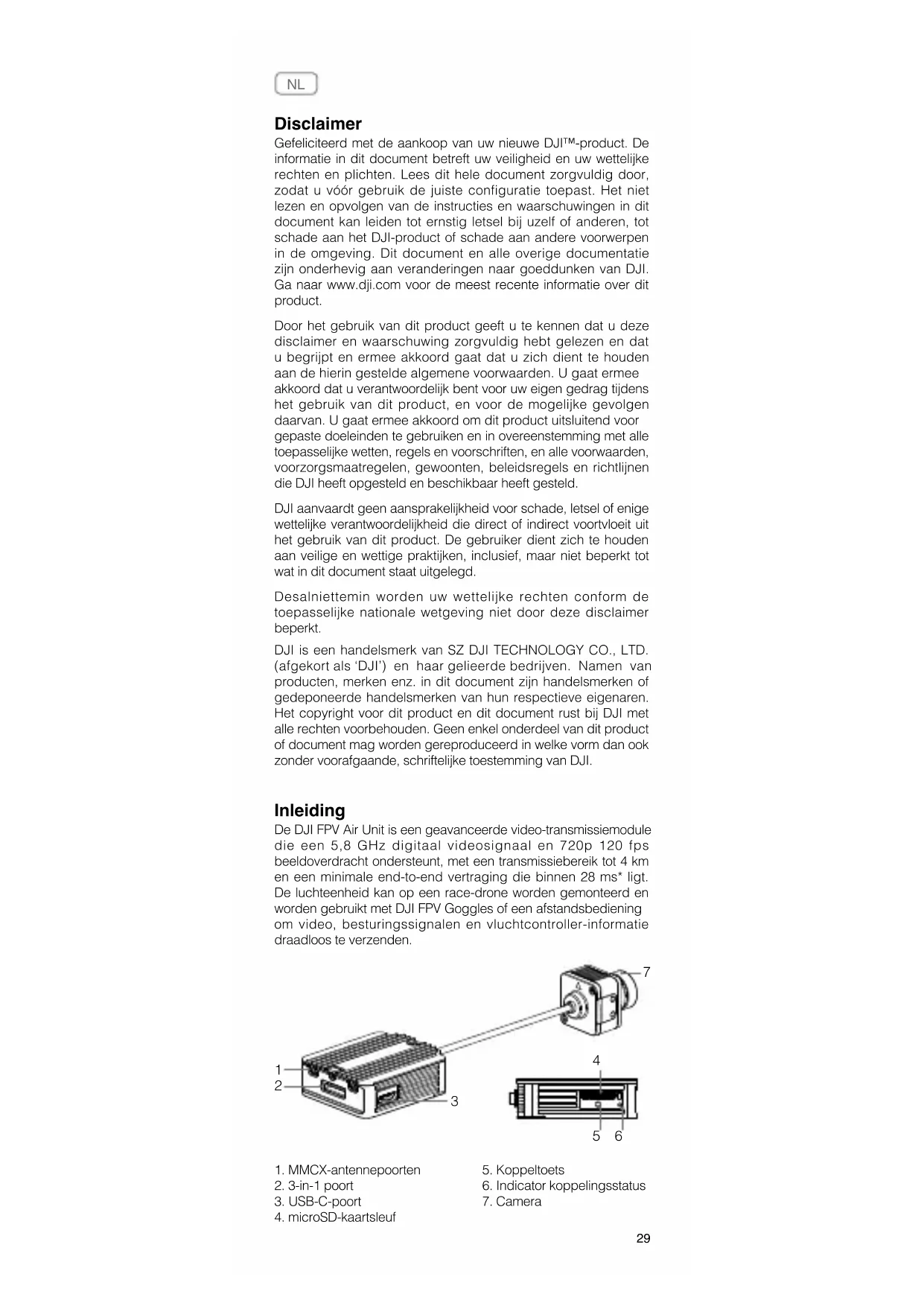 Disclaimer Gefeliciteerd met de aankoop van uw nieuwe DJI™-product. De informatie in dit document betreft uw veiligheid en uw wettelijke rechten en plichten. Lees dit hele document zorgvuldig door, zodat u vóór gebruik de juiste configuratie toepast. Het niet lezen en opvolgen van de instructies en waarschuwingen in dit document kan leiden tot ernstig letsel bij uzelf of anderen, tot schade aan het DJI-product of schade aan andere voorwerpen in de omgeving. Dit document en alle overige documentatie zijn onderhevig aan veranderingen naar goeddunken van DJI. Ga naar www.dji.com voor de meest recente informatie over dit product. Door het gebruik van dit product geeft u te kennen dat u deze disclaimer en waarschuwing zorgvuldig hebt gelezen en dat u begrijpt en ermee akkoord gaat dat u zich dient te houden aan de hierin gestelde algemene voorwaarden. U gaat ermee akkoord dat u verantwoordelijk bent voor uw eigen gedrag tijdens het gebruik van dit product, en voor de mogelijke gevolgen daarvan. U gaat ermee akkoord om dit product uitsluitend voor gepaste doeleinden te gebruiken en in overeenstemming met alle toepasselijke wetten, regels en voorschriften, en alle voorwaarden, voorzorgsmaatregelen, gewoonten, beleidsregels en richtlijnen die DJI heeft opgesteld en beschikbaar heeft gesteld. DJI aanvaardt geen aansprakelijkheid voor schade, letsel of enige wettelijke verantwoordelijkheid die direct of indirect voortvloeit uit het gebruik van dit product. De gebruiker dient zich te houden aan veilige en wettige praktijken, inclusief, maar niet beperkt tot wat in dit document staat uitgelegd. Desalniettemin worden uw wettelijke rechten conform de toepasselijke nationale wetgeving niet door deze disclaimer beperkt. DJI is een handelsmerk van SZ DJI TECHNOLOGY CO., LTD. (afgekort als ‘DJI’) en haar gelieerde bedrijven. Namen van producten, merken enz. in dit document zijn handelsmerken of gedeponeerde handelsmerken van hun respectieve eigenaren. Het copyright voor dit product en dit document rust bij DJI met alle rechten voorbehouden. Geen enkel onderdeel van dit product of document mag worden gereproduceerd in welke vorm dan ook zonder voorafgaande, schriftelijke toestemming van DJI. Inleiding De DJI FPV Air Unit is een geavanceerde video-transmissiemodule die een 5,8 GHz digitaal videosignaal en 720p 120 fps beeldoverdracht ondersteunt, met een transmissiebereik tot 4 km en een minimale end-to-end vertraging die binnen 28 ms* ligt. De luchteenheid kan op een race-drone worden gemonteerd en worden gebruikt met DJI FPV Goggles of een afstandsbediening om video, besturingssignalen en vluchtcontroller-informatie draadloos te verzenden.