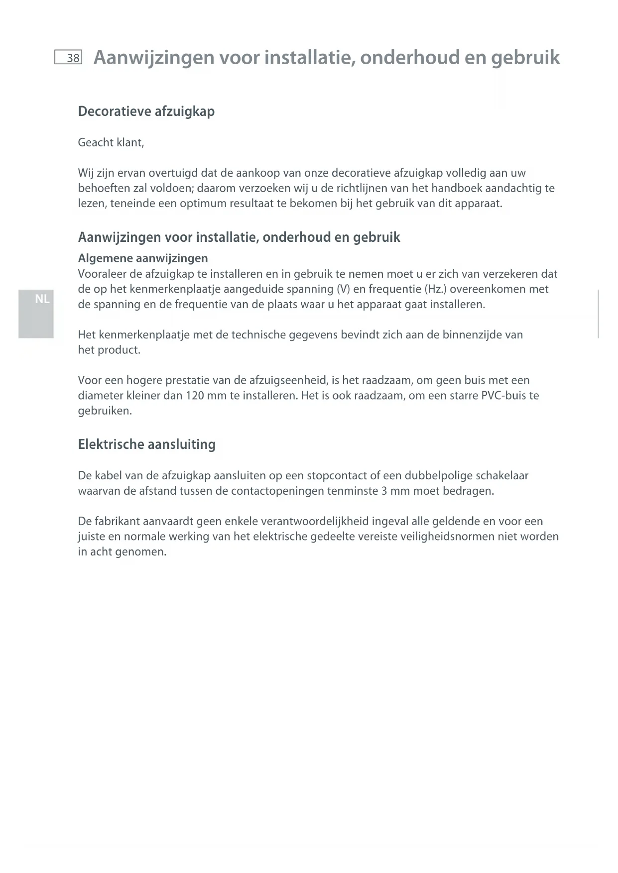 Aanwijzingen voor installatie, onderhoud en gebruik Decoratieve afzuigkap Geacht klant, Wij zijn ervan overtuigd dat de aankoop van onze decoratieve afzuigkap volledig aan uw behoeften zal voldoen; daarom verzoeken wij u de richtlijnen van het handboek aandachtig te lezen, teneinde een optimum resultaat te bekomen bij het gebruik van dit apparaat. Aanwijzingen voor installatie, onderhoud en gebruik Algemene aanwijzingen Vooraleer de afzuigkap te installeren en in gebruik te nemen moet u er zich van verzekeren dat de op het kenmerkenplaatje aangeduide spanning (V) en frequentie (Hz.) overeenkomen met de spanning en de frequentie van de plaats waar u het apparaat gaat installeren. Het kenmerkenplaatje met de technische gegevens bevindt zich aan de binnenzijde van het product. Voor een hogere prestatie van de afzuigseenheid, is het raadzaam, om geen buis met een diameter kleiner dan 120 mm te installeren. Het is ook raadzaam, om een starre PVC-buis te gebruiken. Elektrische aansluiting De kabel van de afzuigkap aansluiten op een stopcontact of een dubbelpolige schakelaar waarvan de afstand tussen de contactopeningen tenminste 3 mm moet bedragen. De fabrikant aanvaardt geen enkele verantwoordelijkheid ingeval alle geldende en voor een juiste en normale werking van het elektrische gedeelte vereiste veiligheidsnormen niet worden in acht genomen.39