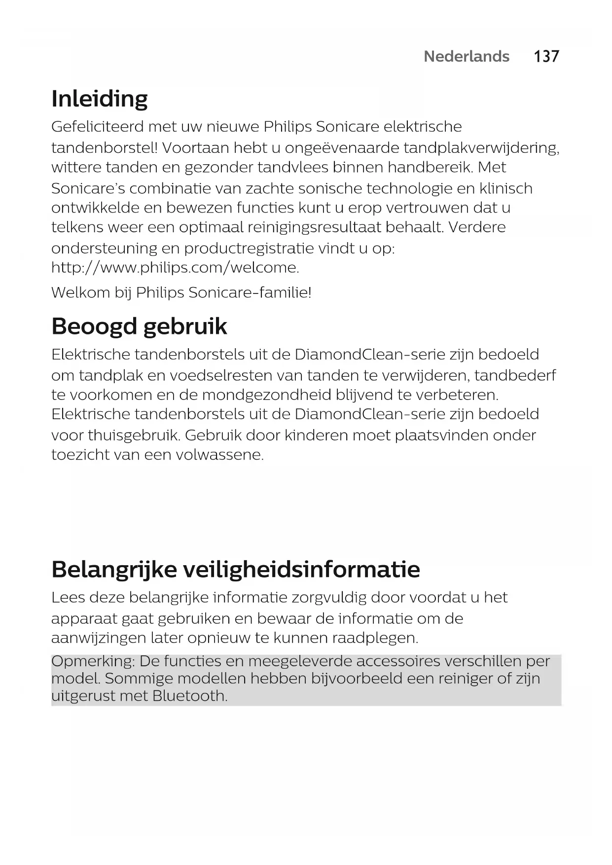 ItalianoNederlands Inleiding Gefeliciteerd met uw nieuwe Philips Sonicare elektrische tandenborstel! Voortaan hebt u ongeëvenaarde tandplakverwijdering, wittere tanden en gezonder tandvlees binnen handbereik. Met Sonicare’s combinatie van zachte sonische technologie en klinisch ontwikkelde en bewezen functies kunt u erop vertrouwen dat u telkens weer een optimaal reinigingsresultaat behaalt. Verdere ondersteuning en productregistratie vindt u op: http://www.philips.com/welcome. Welkom bij Philips Sonicare-familie! Beoogd gebruik Elektrische tandenborstels uit de DiamondClean-serie zijn bedoeld om tandplak en voedselresten van tanden te verwijderen, tandbederf te voorkomen en de mondgezondheid blijvend te verbeteren. Elektrische tandenborstels uit de DiamondClean-serie zijn bedoeld voor thuisgebruik. Gebruik door kinderen moet plaatsvinden onder toezicht van een volwassene. Belangrijke veiligheidsinformatie Lees deze belangrijke informatie zorgvuldig door voordat u het apparaat gaat gebruiken en bewaar de informatie om de aanwijzingen later opnieuw te kunnen raadplegen. Opmerking: De functies en meegeleverde accessoires verschillen per model. Sommige modellen hebben bijvoorbeeld een reiniger of zijn uitgerust met Bluetooth.
