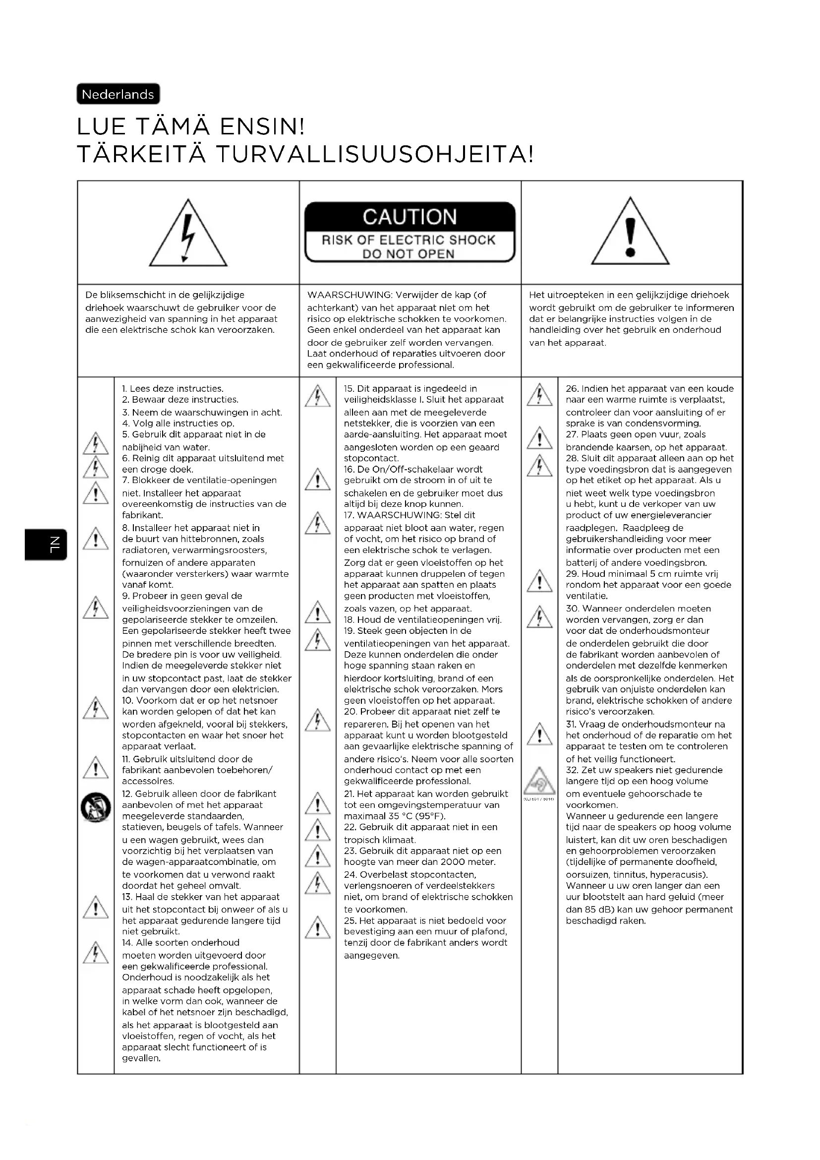 - Poids 5,95 kg (13.1 lbs) 9,4 kg (20.7 lbs)NL LUE TÄMÄ ENSIN! TÄRKEITÄ TURVALLISUUSOHJEITA! Nederlands De bliksemschicht in de gelijkzijdige driehoek waarschuwt de gebruiker voor de aanwezigheid van spanning in het apparaat die een elektrische schok kan veroorzaken. WAARSCHUWING: Verwijder de kap (of achterkant) van het apparaat niet om het risico op elektrische schokken te voorkomen. Geen enkel onderdeel van het apparaat kan door de gebruiker zelf worden vervangen. Laat onderhoud of reparaties uitvoeren door een gekwalificeerde professional. Het uitroepteken in een gelijkzijdige driehoek wordt gebruikt om de gebruiker te informeren dat er belangrijke instructies volgen in de handleiding over het gebruik en onderhoud van het apparaat.