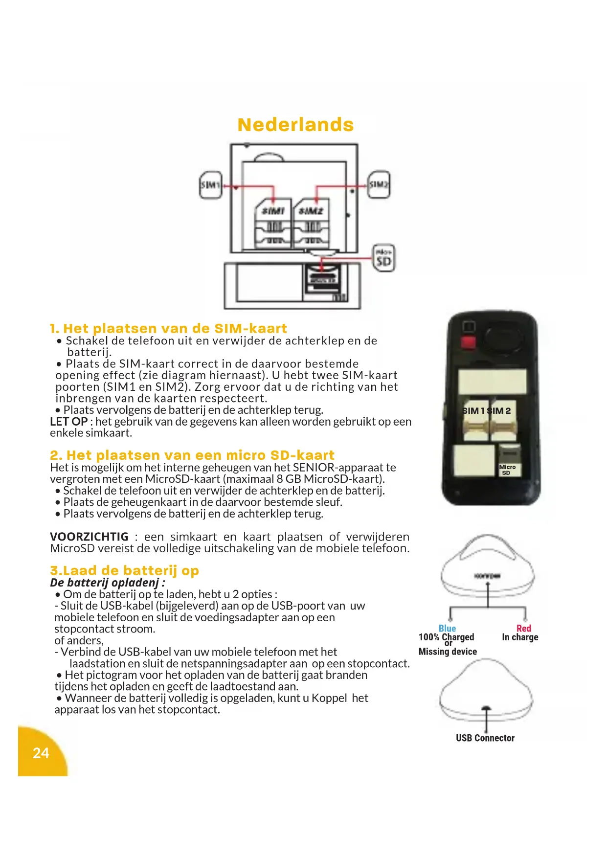 - Het opladen van de mobiel gebeurt alleen via de USB-poort en / of of het laadstation.