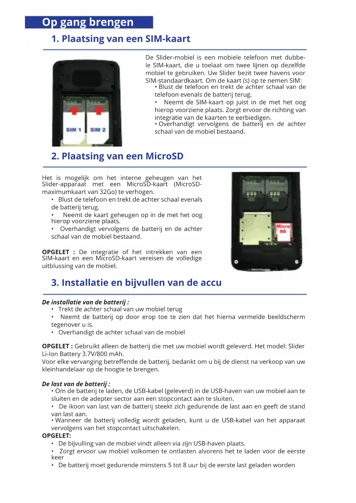- In ogni caso, la garanzia legale per vizi occulti sarà applicata conformemente agli articoli 1641 e seguenti del Codice Civile francese.Gebruiker GuideDe Slider-mobiel is een mobiele telefoon met dubbe- le SIM-kaart, die u toelaat om twee lijnen op dezelfde mobiel te gebruiken. Uw Slider bezit twee havens voor SIM-standaardkaart. Om de kaart (s) op te nemen SIM: