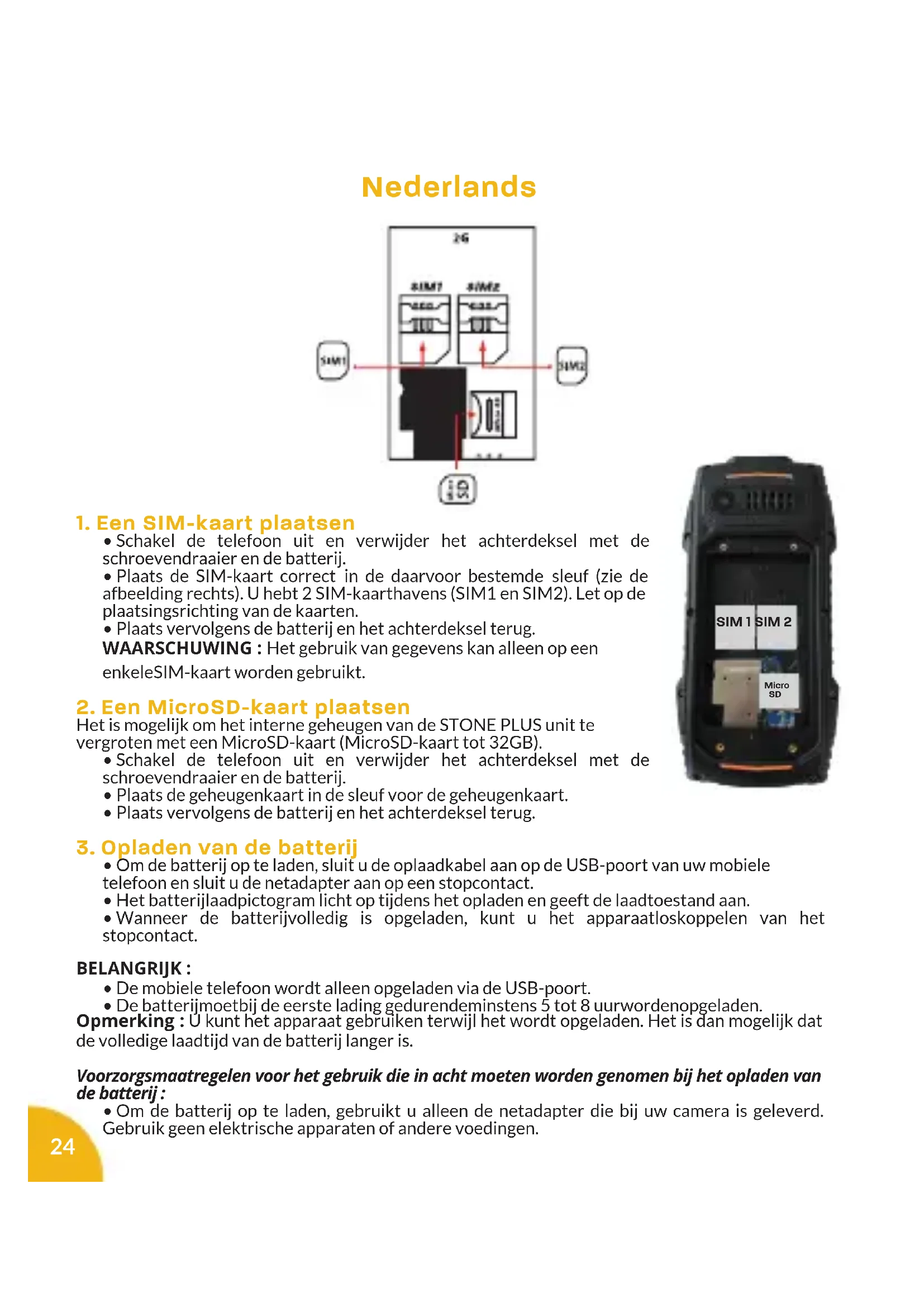 - 1 Cargador con cable USB • 1 Kit peatón Konrow bedankt u voor het kiezen van de STONE PLUS mobiele telefoon. In deze gids vindt u alle informatie die u nodig heeft om deze mobiele telefoon te gebruiken. WAARSCHUWING : Alle verpakkingsmaterialen, zoals tape, plastic folie, touw en etiketten zijn niet inbegrepen in dit product. INHOUD VAN DE DOOS :