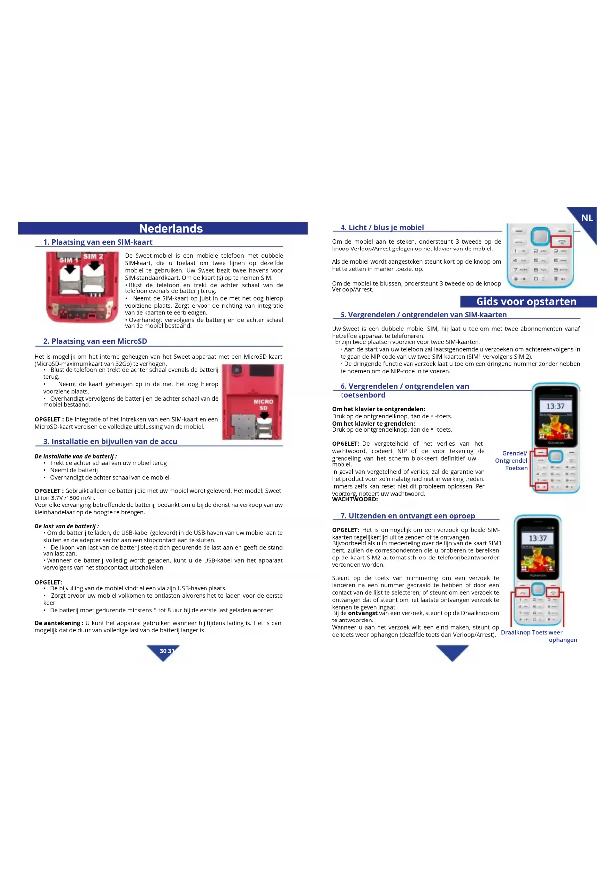 - Overhandigt de achter schaal van de mobiel OPGELET : Gebruikt alleen de batterij die met uw mobiel wordt geleverd. Het model: Sweet Li-ion 3.7V /1300 mAh. Voor elke vervanging betreende de batterij, bedankt om u bij de dienst na verkoop van uw kleinhandelaar op de hoogte te brengen. De last van de batterij :