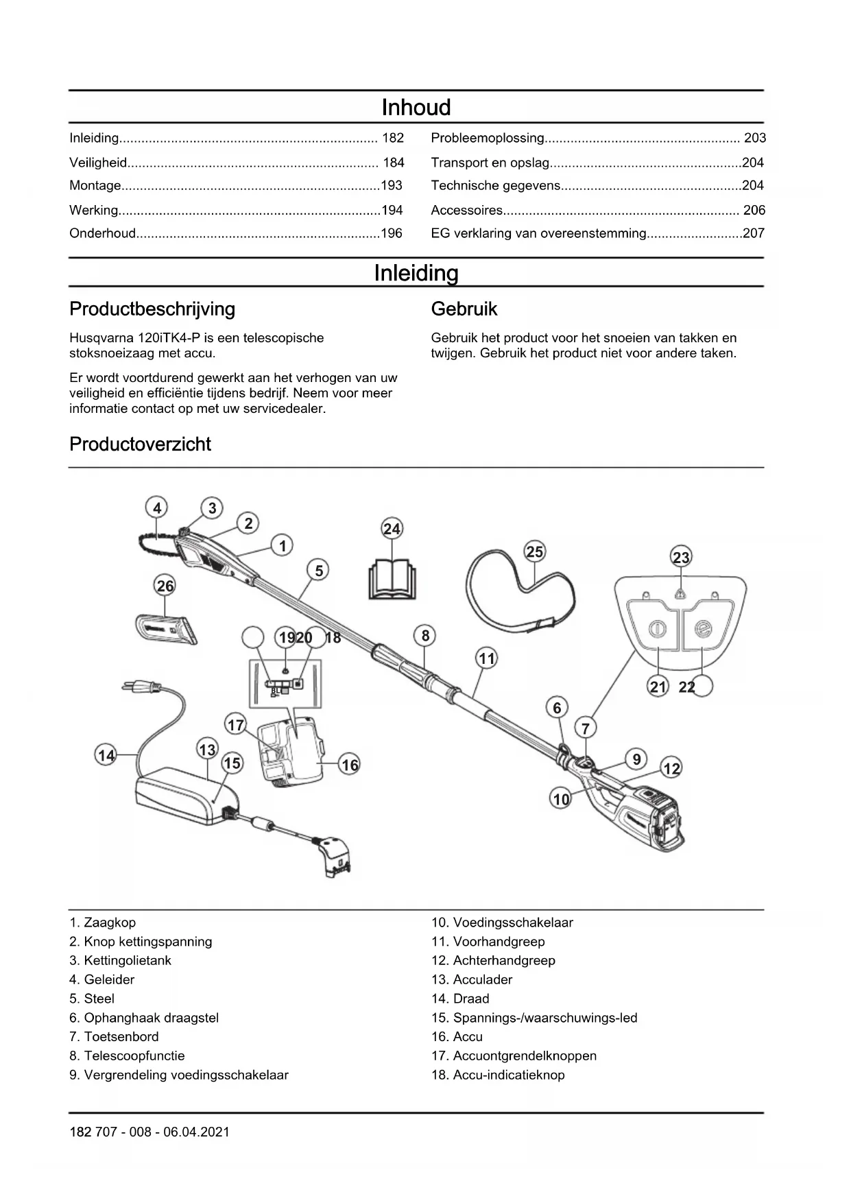 - EG verklaring van overeenstemming Inleiding Productbeschrijving Husqvarna 120iTK4-P is een telescopische stoksnoeizaag met accu. Er wordt voortdurend gewerkt aan het verhogen van uw veiligheid en efficiëntie tijdens bedrijf. Neem voor meer informatie contact op met uw servicedealer. Gebruik Gebruik het product voor het snoeien van takken en twijgen. Gebruik het product niet voor andere taken. Productoverzicht p. 207