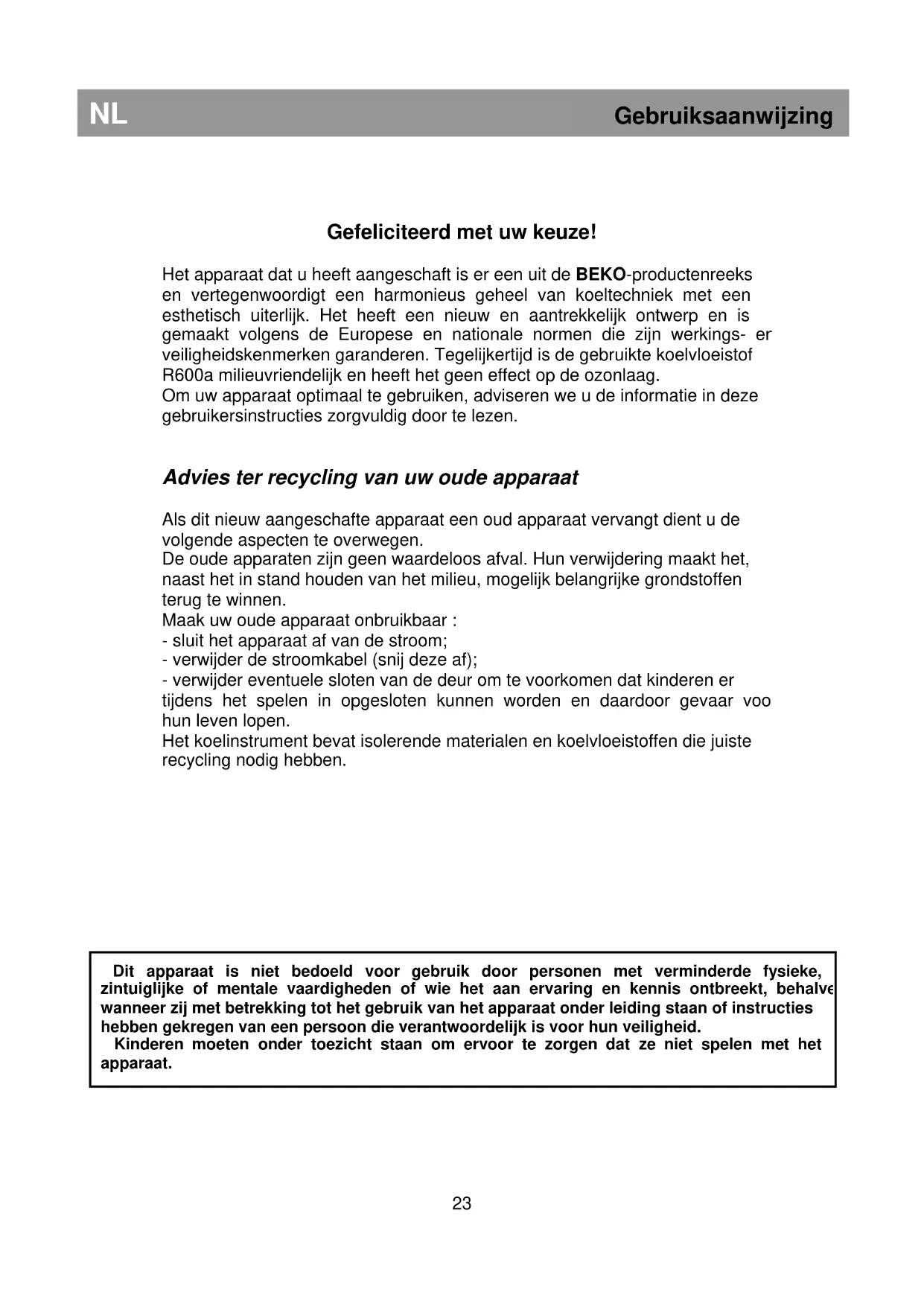 NL Gebruiksaanwijzing Gefeliciteerd met uw keuze! Het apparaat dat u heeft aangeschaft is er een uit de BEKO-productenreeks en vertegenwoordigt een harmonieus geheel van koeltechniek met een esthetisch uiterlijk. Het heeft een nieuw en aantrekkelijk ontwerp en is gemaakt volgens de Europese en nationale normen die zijn werkings- en veiligheidskenmerken garanderen. Tegelijkertijd is de gebruikte koelvloeistof R600a milieuvriendelijk en heeft het geen effect op de ozonlaag. Om uw apparaat optimaal te gebruiken, adviseren we u de informatie in deze gebruikersinstructies zorgvuldig door te lezen.