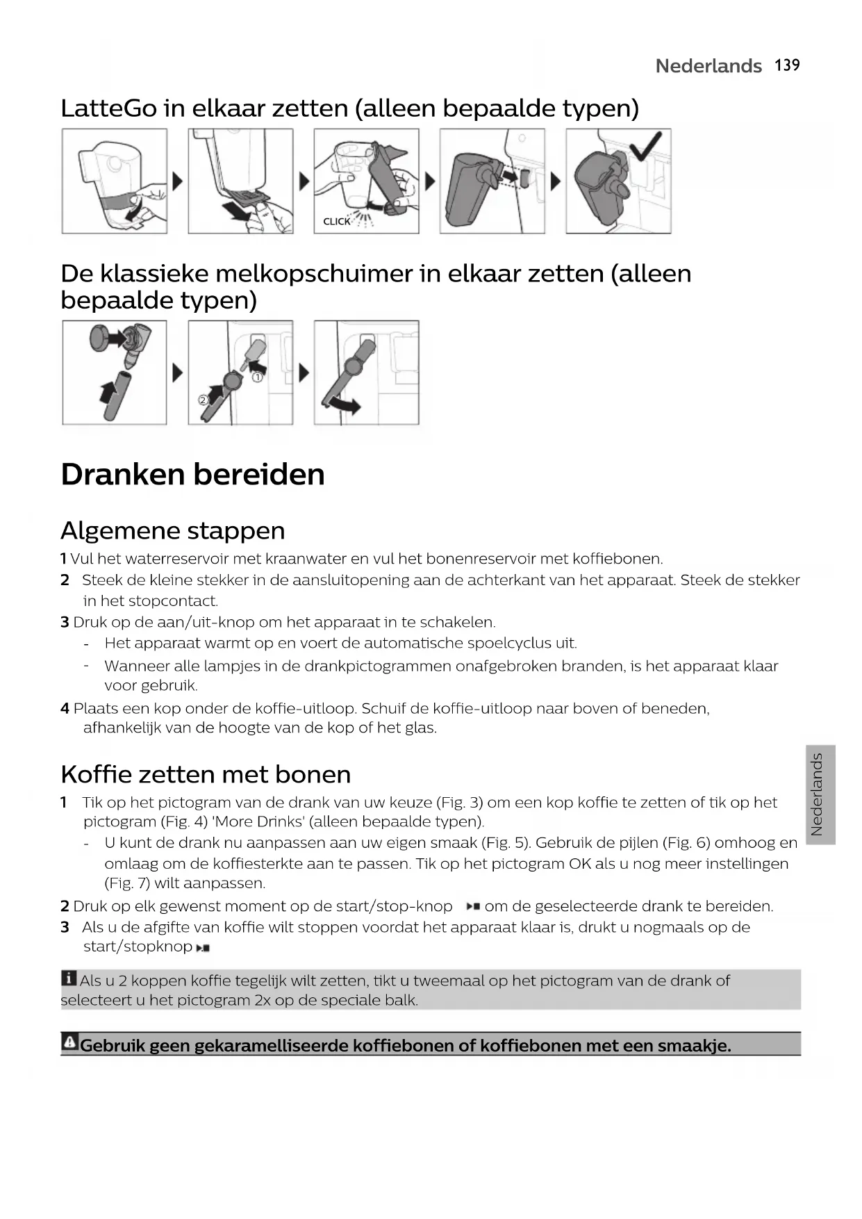 Nederlands NederlandsHet apparaat past automatisch de hoeveelheid gemalen koffie aan die wordt gebruikt, om de lekkerste koffie te maken. Na de eerste vijf koppen koffie is het apparaat helemaal goed ingesteld. Spoel de LatteGo (melkreservoir) of de klassieke melkopschuimer af voor het eerste gebruik. Vóór het eerste gebruik