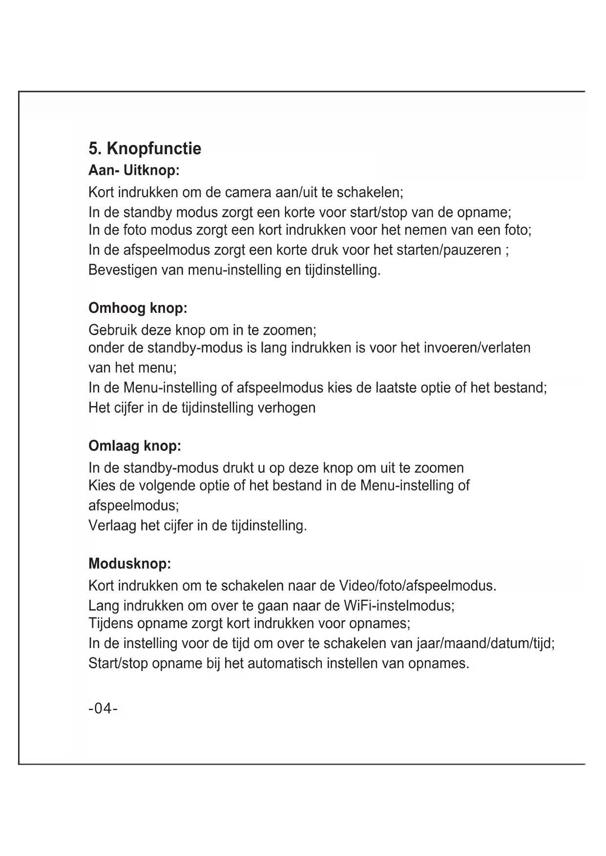 Kort indrukken om de camera aan/uit te schakelen; In de standby modus zorgt een korte voor start/stop van de opname; In de foto modus zorgt een kort indrukken voor het nemen van een foto; In de afspeelmodus zorgt een korte druk voor het starten/pauzeren ; Bevestigen van menu-instelling en tijdinstelling. Omhoog knop: Gebruik deze knop om in te zoomen; onder de standby-modus is lang indrukken is voor het invoeren/verlaten van het menu; In de Menu-instelling of afspeelmodus kies de laatste optie of het bestand; Het cijfer in de tijdinstelling verhogen Omlaag knop: In de standby-modus drukt u op deze knop om uit te zoomen Kies de volgende optie of het bestand in de Menu-instelling of afspeelmodus; Verlaag het cijfer in de tijdinstelling. Modusknop: Kort indrukken om te schakelen naar de Video/foto/afspeelmodus. Lang indrukken om over te gaan naar de WiFi-instelmodus; Tijdens opname zorgt kort indrukken voor opnames; In de instelling voor de tijd om over te schakelen van jaar/maand/datum/tijd; Start/stop opname bij het automatisch instellen van opnames. Aan- Uitknop:6. Bediening Aan/Uitschakelen Inschakelen: kort indrukken / aan-uitknop, het scherm toont de opstartfoto, de blauwe werkingsindicatoren zullen oplichten, Camera gaat over naar de standby-modus. Uitschakelen: als camera ingeschakeld is, druk lang op de aan- uitknop om de camera uit te schakelen. Batterij invoegen/verwijderen De Camera heeft een verwisselbare Li-Ion batterij. Voor het invoegen of wisselen de batterij Verwijder het frontpaneel van de camera. Opladen van de batterij Verbind de USB-kabel met de camera op een USB-poort op uw computer of een USB-lader. Het rode lampje zal oplichten tijdens het opladen. Zodra de batterij volledig is opgeladen, zal het rode lampje uitschakelen. Schakel de Camera uit tijdens het opladen voor sneller opladen van de batterij. Videomodus Pictogrammen op het Video-scherm: