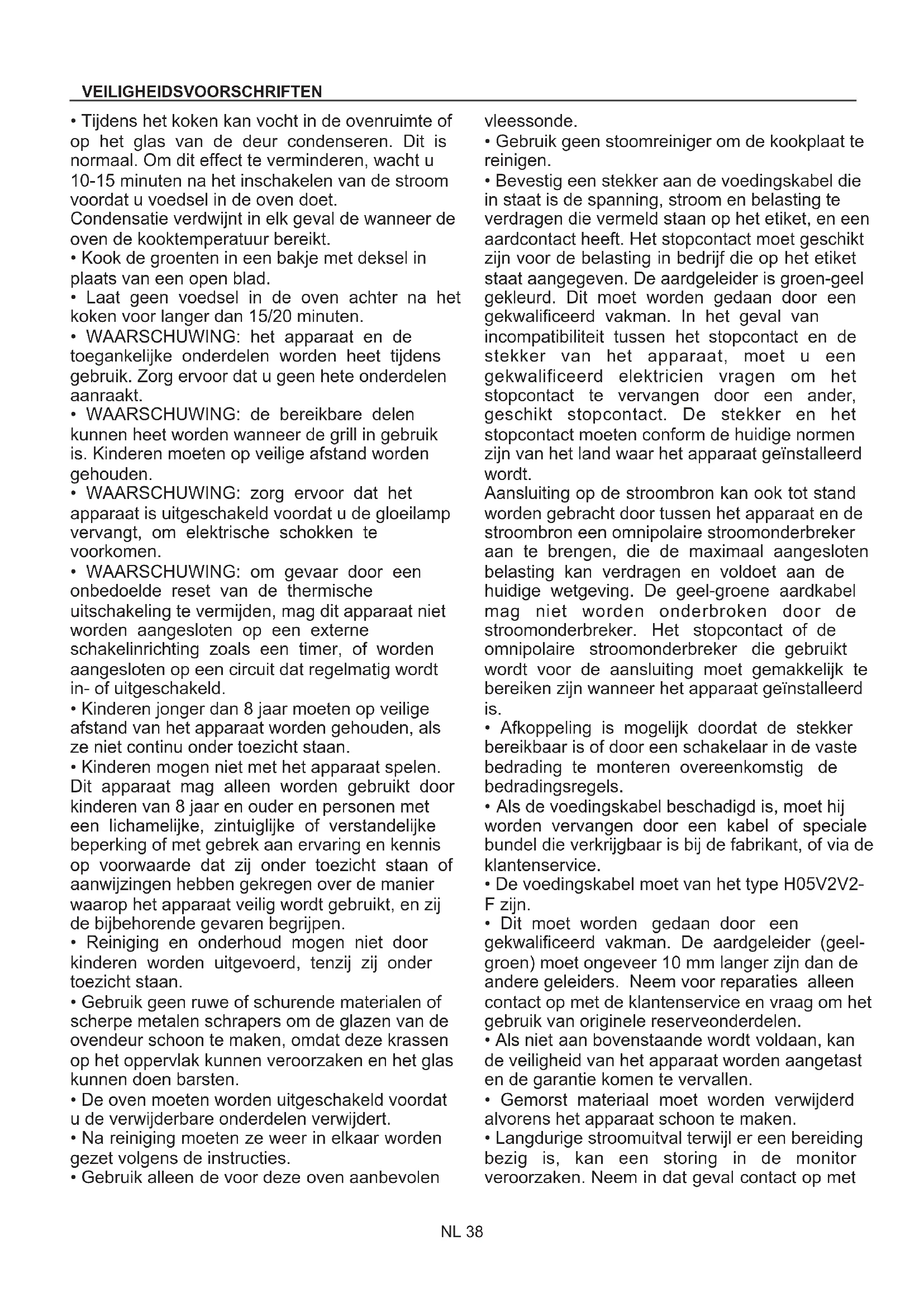 Steek de stekker in een correct geïnstalleerd geaard stopcontact. Bij modellen zonder stekker dient met een standaardstekker aan te brengen, die geschikt is voor het op het typeplaatje vermelde vermogen. De aarddraad is geel/groen. Deze verbinding dient door een technisch bevoegd persoon uitgevoerd te worden. Indien het stopcontact en de stekker niet op elkaar afgestemd zijn, laat dan een technisch bevoegd persoon een ander stopcontact installeren. Deze dient ook na te gaan of de draaddoor- snede van het stopcontact geschikt is voor het door het apparaat opgenomen vermogen. Aansluiting kan ook plaatsvinden door een geschikte meerpolige (aan/uit) schakelaar te plaatsen tussen het elektrische net en het apparaat, die aan de geldende normen voldoet. Zorg ervoor dat de (geel/groen) geaarde kabel de schakelaar niet raakt. Het stopcontact of de meerpolige schakelaar dienen op een gemakkelijk toegankelijke plaats bij de oven gemonteerd te worden. Belangrijk: Zorg er bij de installatie voor dat de voedingskabel nergens warmer kan worden dan 50°C. De oven voldoet aan de veiligheidseisen als voorzien in de normen van de desbetreffende instituten. De elektrische veiligheid wordt uitsluitend gegarandeerd indien het apparaart op de juiste wijze met een doelmatige aardingsinstallatie is verbonden ingevolge de huidige normen m.b.t. elektrische veiligheid. Ga na of aan deze fundamentele veiligheidseis is voldaan en laat de installatie, ingeval van twijfel, grondig nakijken door een installateur. Ga na of het elektrische vermogen van de stopcontacten overeenkomt met het maximum vermogen van het apparaat, zoals is aangegeven op het typeplaatje. Haal er, in geval van twijfel, een technisch bevoegd persoon bij. De fabrikant is niet verantwoordelijk voor eventuele persoonlijke of materiële schade als gevolg van de nietaarding van de installatie. ATTENTIE: De spanning en energieverbruik staan vermeld op de modelsticker (laatste pagina).