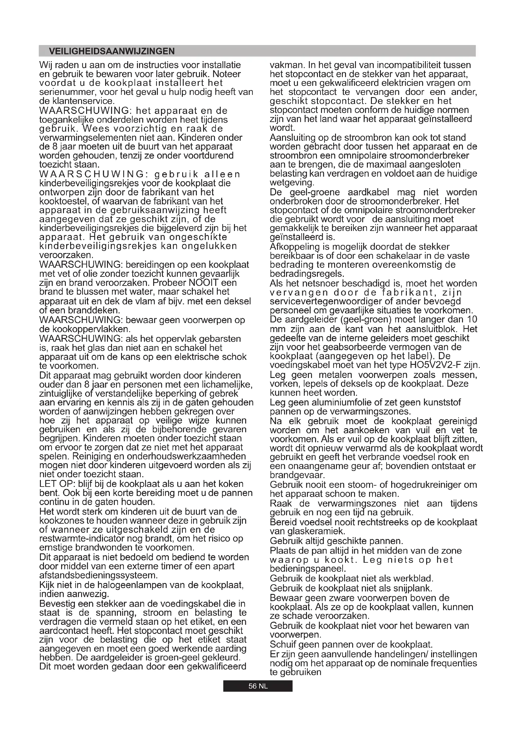 flexibel staal. Belangrijk: controleer nadat u alle installatie handelingen heeft verricht de aansluitpunten op een goede afsluiting. Gebruik hiervoor een zeepsopje. Nooit een vlam. Controleer ook of de flexibele slang niet in aanraking komt met bewegende delen van de keukenmeubelen zoals een lade zodat de slang wordt beschadigd. Let op: als u een gasgeur ruikt die uit het toestel lijkt te komen, schakel dan onmiddellijk de gastoevoer dicht en bel een gekwalificeerde persoon. Ga niet op zoek naar een lek met een vlam. Wanneer die voedingskabel beschadigd is, dient deze vervangen te worden door een erkende reparateur, om onnodige risico's te vermijden. De aarde-draad (groen en geel van kleur) moet ten minste 10 mm langer zijn dan de beide andere draden. De doorsnee van de kabel moet in een goede verhouding staan tot de maximale aansluitwaarde van de kookplaat. Zie voor de netspanningsgegevens het typeplaatje op de kookplaat en controleer of het nieuwe netsnoer van het type H05 V2V2-F is. In het onwaarschijnlijke geval dat een scheur zou verschijnen op het glas, haal onmiddellijk de en neem contact opstekker uit het contact met de klantenservice. Het apparaat is niet bedoeld voor gebruik met een externe timer of afstandsbediening.