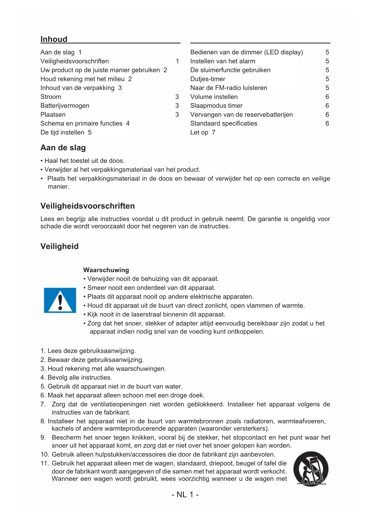 Bedienen van de dimmer (LED display) Instellen van het alarm De sluimerfunctie gebruiken Dutjes-timer Naar de FM-radio luisteren Volume instellen Slaapmodus timer Vervangen van de reservebatterijen Standaard specificaties Let op 7 Aan de slag