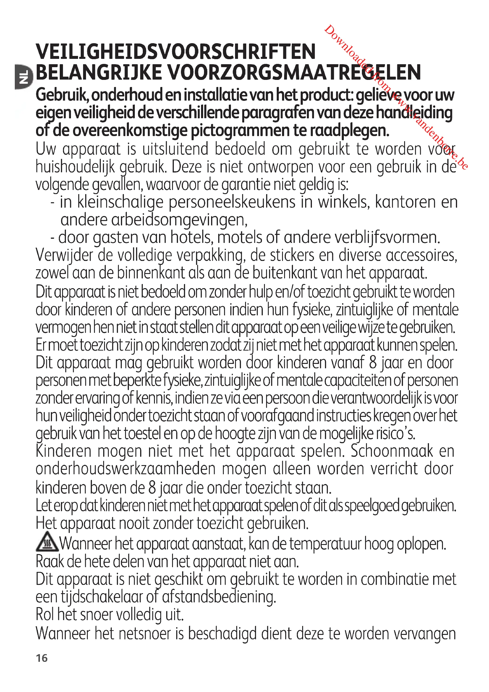 VEILIGHEIDSVOORSCHRIFTEN BELANGRIJKE VOORZORGSMAATREGELEN Gebruik, onderhoud en installatie van het product: gelieve voor uw eigen veiligheid de verschillende paragrafen van deze handleiding of de overeenkomstige pictogrammen te raadplegen. Uw apparaat is uitsluitend bedoeld om gebruikt te worden voor huishoudelijk gebruik. Deze is niet ontworpen voor een gebruik in de volgende gevallen, waarvoor de garantie niet geldig is: - in kleinschalige personeelskeukens in winkels, kantoren en andere arbeidsomgevingen, - door gasten van hotels, motels of andere verblijfsvormen. Verwijder de volledige verpakking, de stickers en diverse accessoires, zowel aan de binnenkant als aan de buitenkant van het apparaat. Dit apparaat is niet bedoeld om zonder hulp en/of toezicht gebruikt te worden door kinderen of andere personen indien hun fysieke, zintuiglijke of mentale vermogen hen niet in staat stellen dit apparaat op een veilige wijze te gebruiken. Er moet toezicht zijn op kinderen zodat zij niet met het apparaat kunnen spelen. Dit apparaat mag gebruikt worden door kinderen vanaf 8 jaar en door personen met beperkte fysieke, zintuiglijke of mentale capaciteiten of personen zonder ervaring of kennis, indien ze via een persoon die verantwoordelijk is voor hun veiligheid onder toezicht staan of voorafgaand instructies kregen over het gebruik van het toestel en op de hoogte zijn van de mogelijke risico’s. Kinderen mogen niet met het apparaat spelen. Schoonmaak en onderhoudswerkzaamheden mogen alleen worden verricht door kinderen boven de 8 jaar die onder toezicht staan. Let erop dat kinderen niet met het apparaat spelen of dit als speelgoed gebruiken. Het apparaat nooit zonder toezicht gebruiken. Wanneer het apparaat aanstaat, kan de temperatuur hoog oplopen. Raak de hete delen van het apparaat niet aan. Dit apparaat is niet geschikt om gebruikt te worden in combinatie met een tijdschakelaar of afstandsbediening. Rol het snoer volledig uit. Wanneer het netsnoer is beschadigd dient deze te worden vervangen Downloaded from www.vandenborre.be17